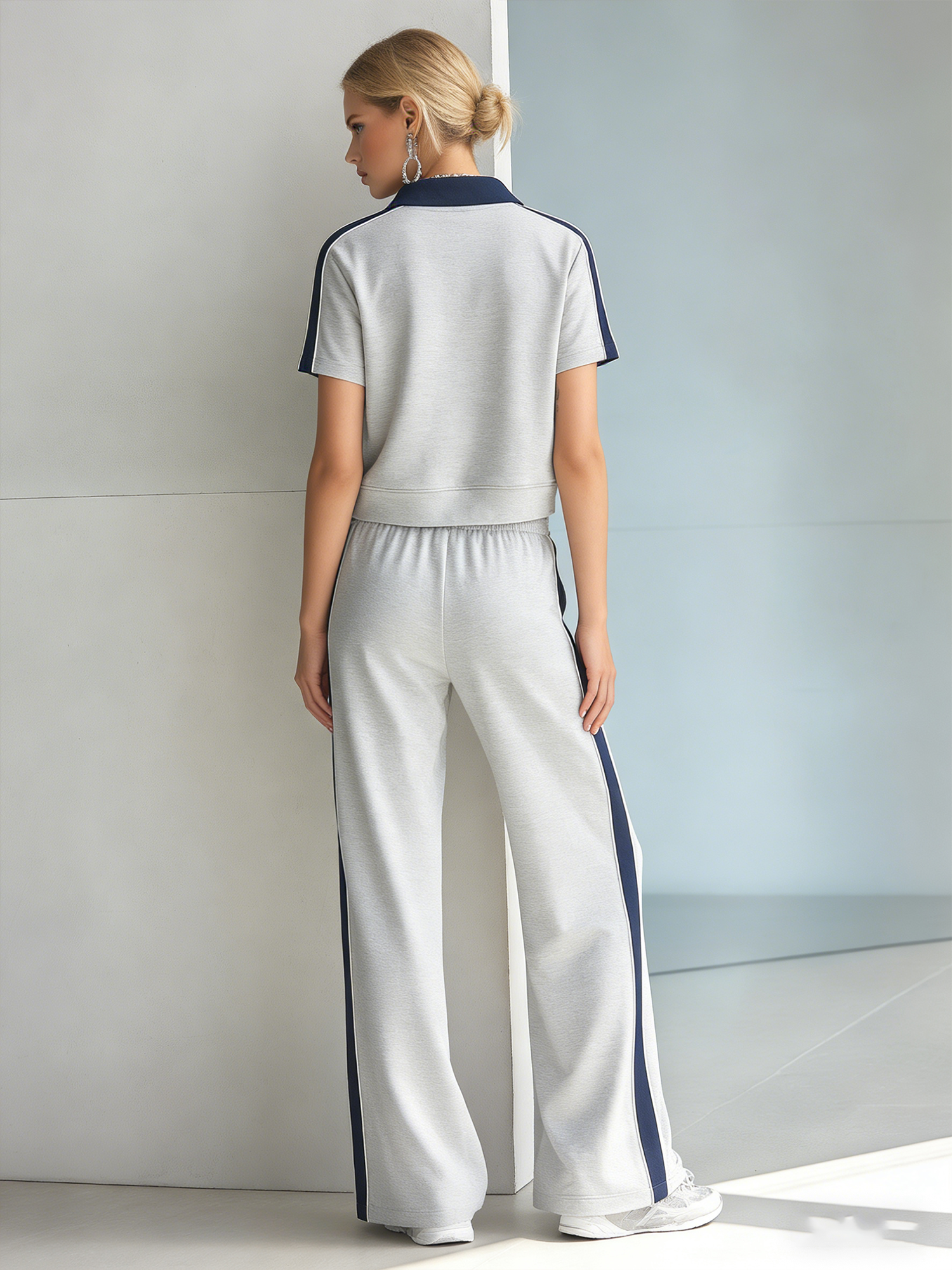 The Women's Fashionable Casual Gray Half-zip Short-sleeved Top and Wide-leg Pants Set is a stylish and versatile ensemble designed for modern women. The outfit features a chic gray color, perfect for various occasions ranging from casual outings to relaxed gatherings.