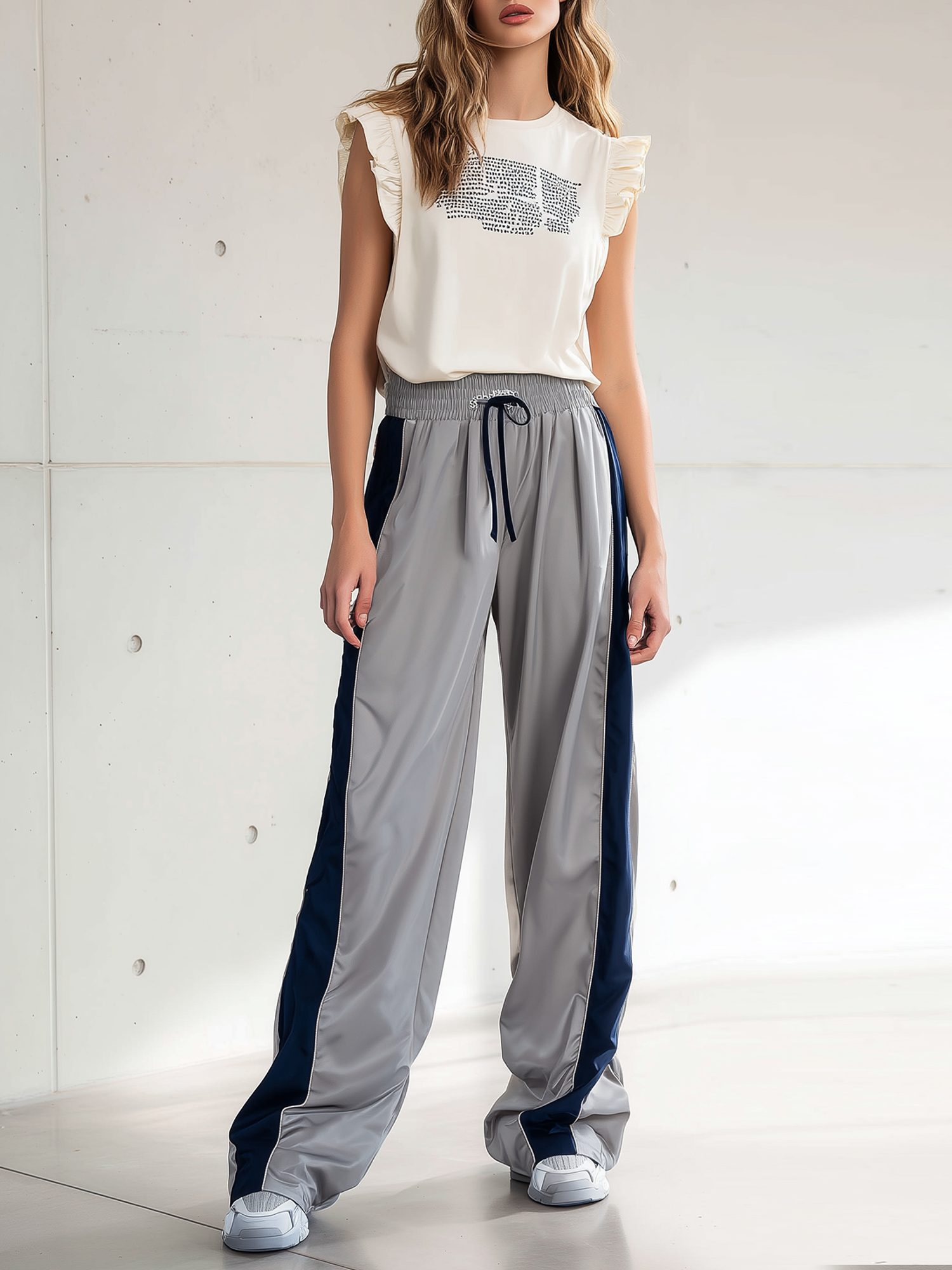 Women's Stylish Casual Off-white Ruffled Top Paired With Casual Trousers Set