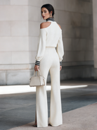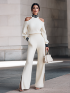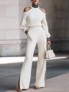 This elegant two-piece set for women features an off-white knitted sweater with an off-shoulder high neck design paired with woven ribbed split wide-leg pants. The ensemble exudes sophistication, making it perfect for both commuting and date nights. The off-shoulder high neck adds a modern twist to a classic silhouette, while the wide-leg pants with stylish ribbed splits offer a comfortable yet chic look.