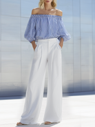 This blue-and-white striped off-shoulder top and pants set is a versatile staple for anyone seeking comfortable, stylish warm-weather dressing. With an easygoing silhouette and classic stripe motif, it works equally well for relaxed weekends, seaside escapes, and casual gatherings — simple to wear, easy to style.