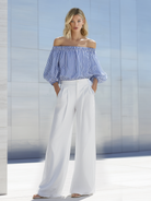 This two-piece set features a classic blue-and-white stripe pattern for a fresh, nautical-inspired look. The off-shoulder top highlights the collarbone with an elasticized neckline and a relaxed silhouette, while the matching pants offer a comfortable, easy-to-wear fit — together they create a cohesive, casual outfit perfect for warm-weather days.