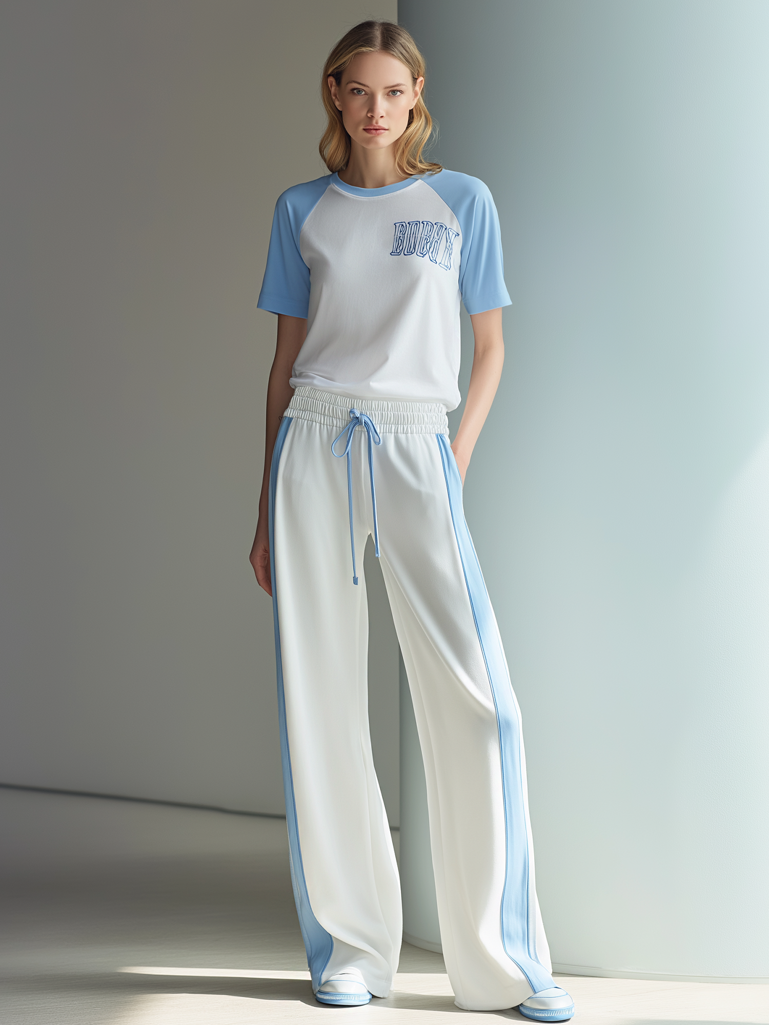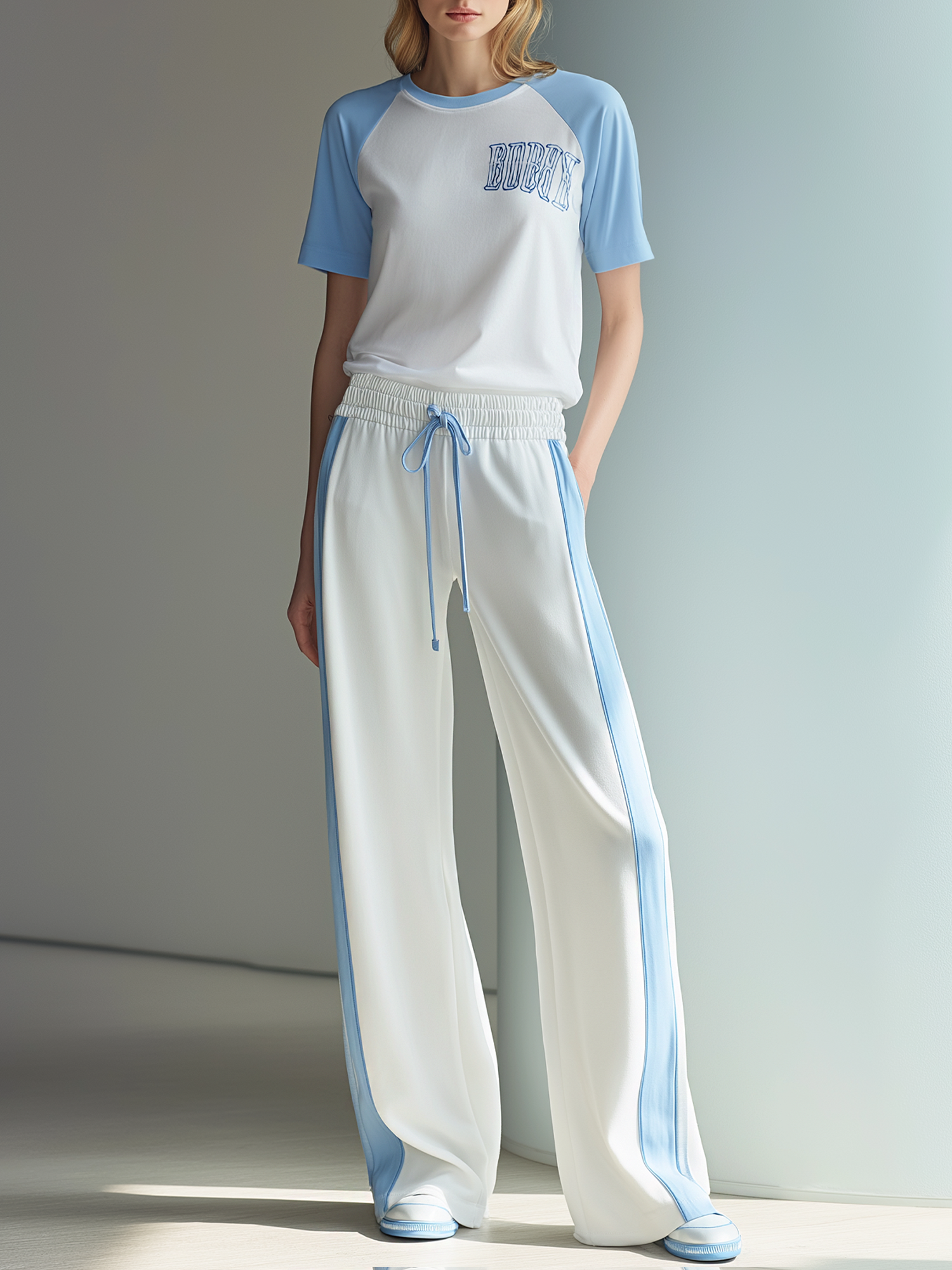 This two-piece casual set features a white T-shirt with contrasting blue raglan sleeves and a coordinating pair of pants. The T-shirt is finished with a printed motif on the front and a classic crew neckline for an everyday sporty look. The pants are designed for comfort and easy movement, making this set ideal for lounging, travel, or relaxed day-to-day wear.
