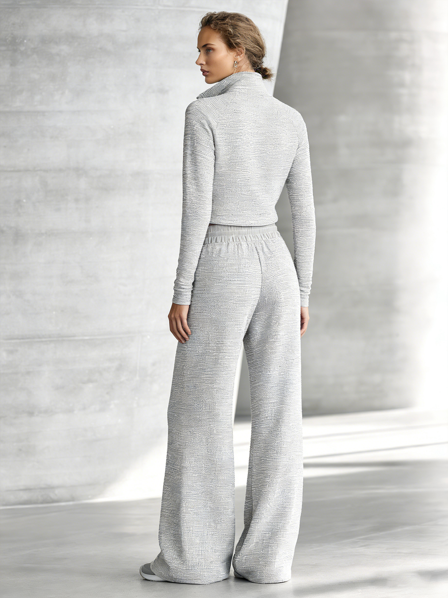 Women's Fashionable Casual Grey Textured Half-zip Top And Wide-leg Pants Set