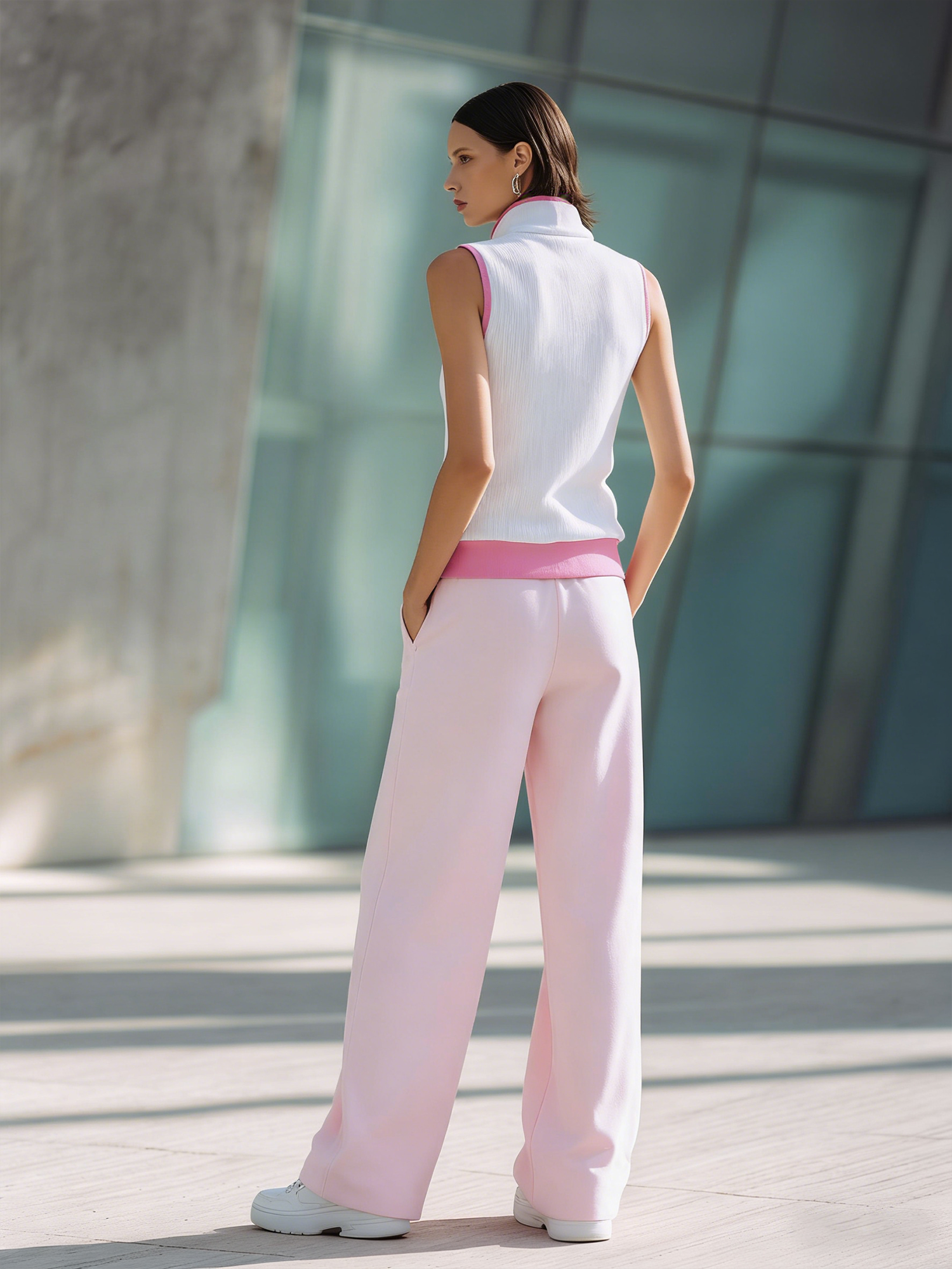 Women's Fashionable Sporty White And Pink Color-blocked Sleeveless Top And Trousers Set