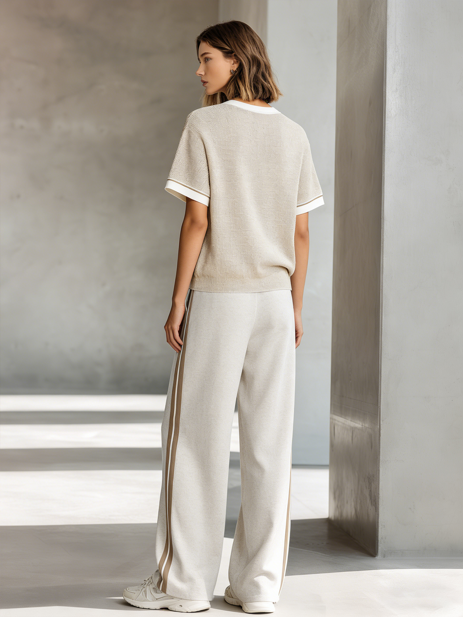 Light Apricot Knit Short-Sleeve Top With White Accents Wide-Leg Casual Pants Set