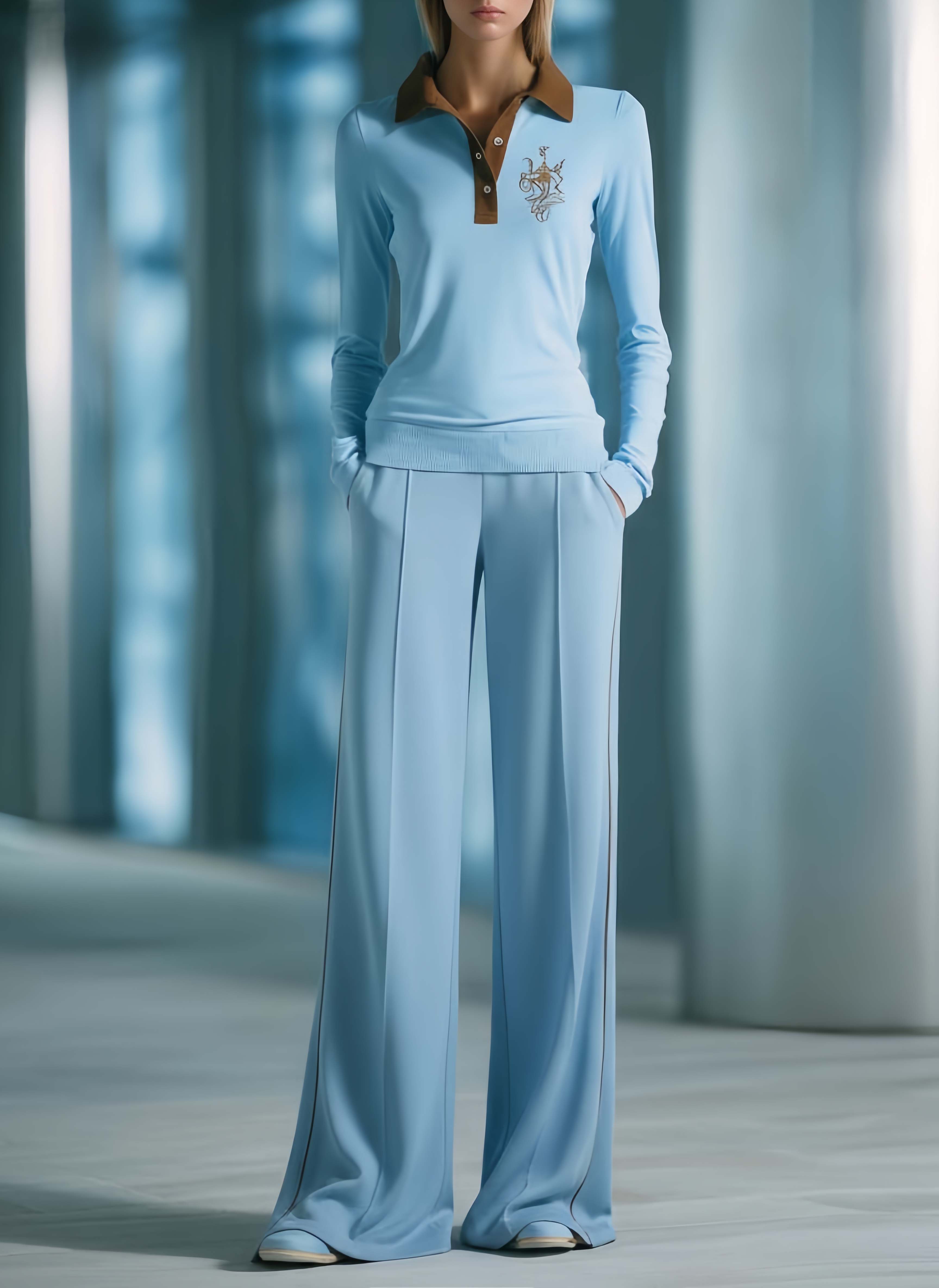 Women's Stylish Casual Blue Lapel Long-sleeved Top And Trousers Set