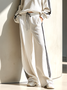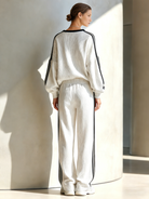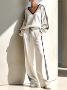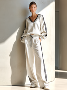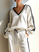 Women's Stylish Casual White Color-block V-neck Top And Trousers Set