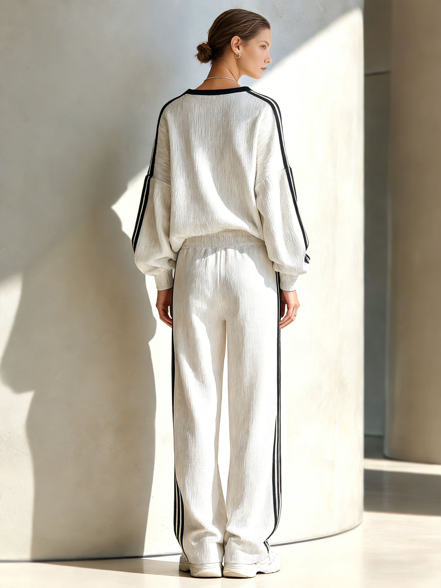 DescriptionThis Women's Stylish Casual White Color-block V-neck Top And Trousers Set is a perfect blend of modern style and comfort. The set features a sleek V-neck top that beautifully complements the matching trousers, creating a seamless look that exudes elegance and fashion-forward thinking. Features