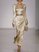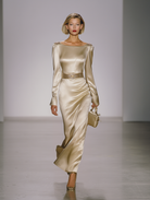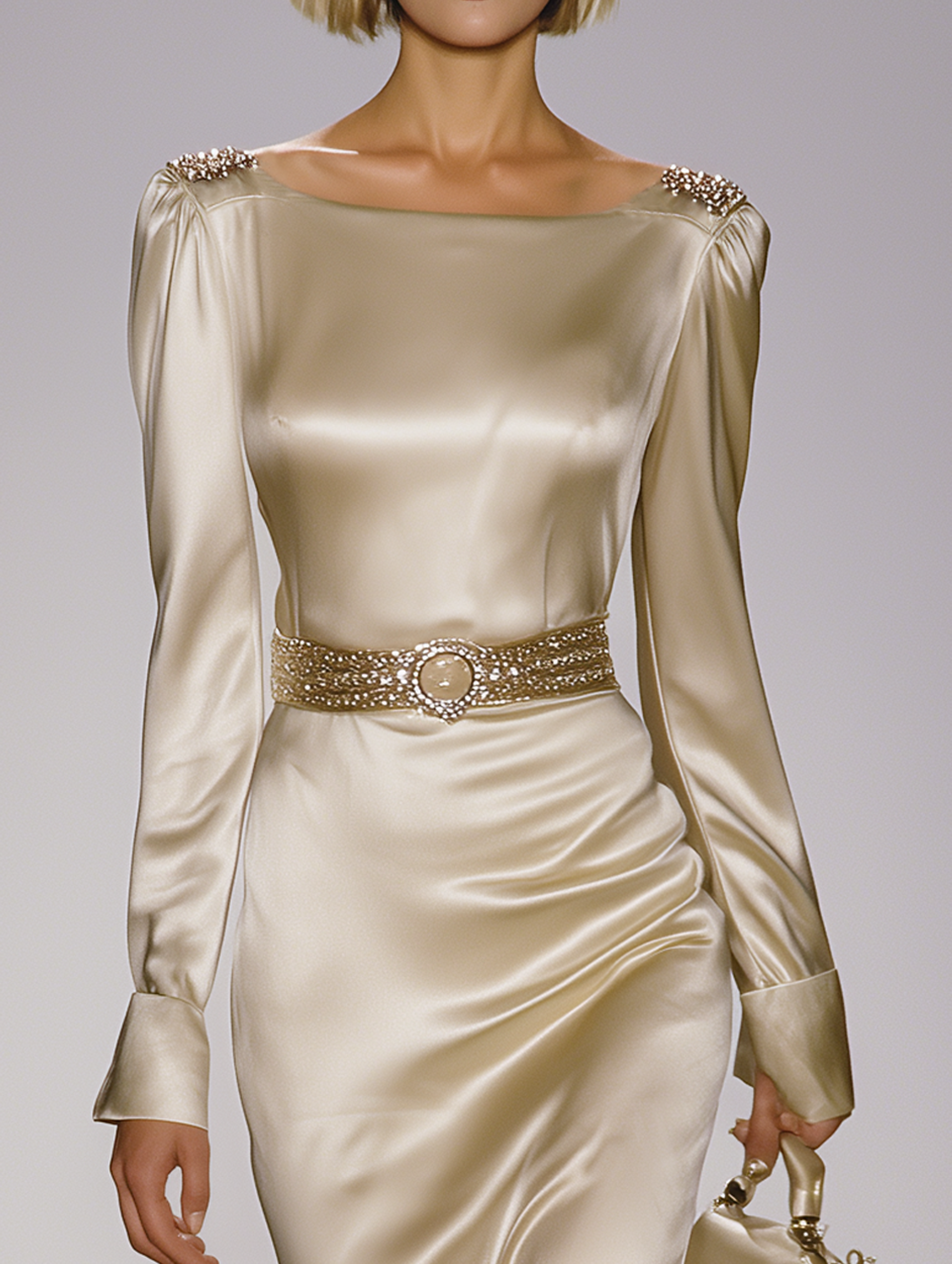 This champagne-colored satin dress is a perfect choice for formal events, offering a perfect balance of elegance, sophistication, and modern glamour. Its exquisite detailing and classic silhouette make it a timeless addition to any wardrobe.