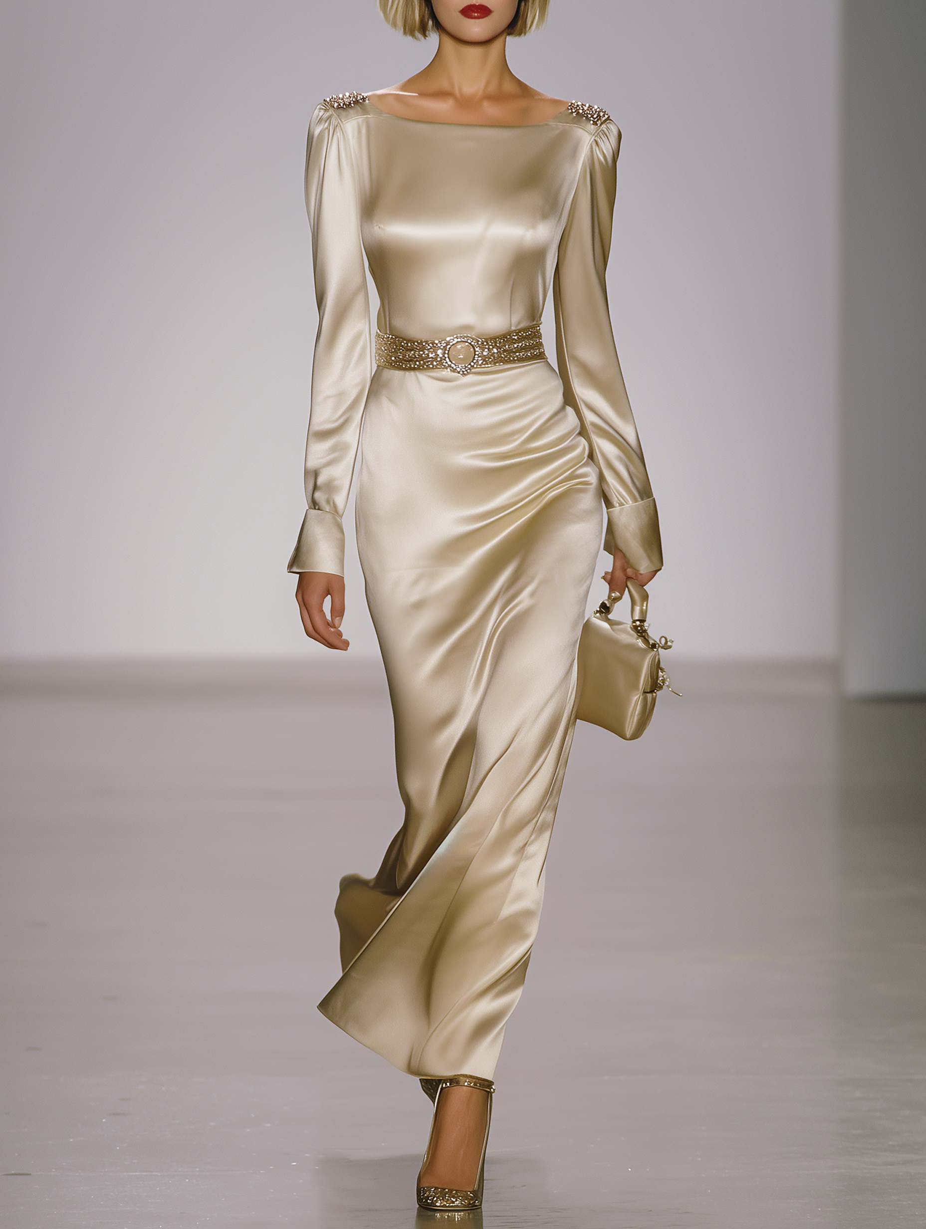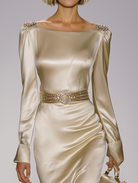 Champagne-colored Elegant Satin Beaded Long Dress For Ladies' Evening Events