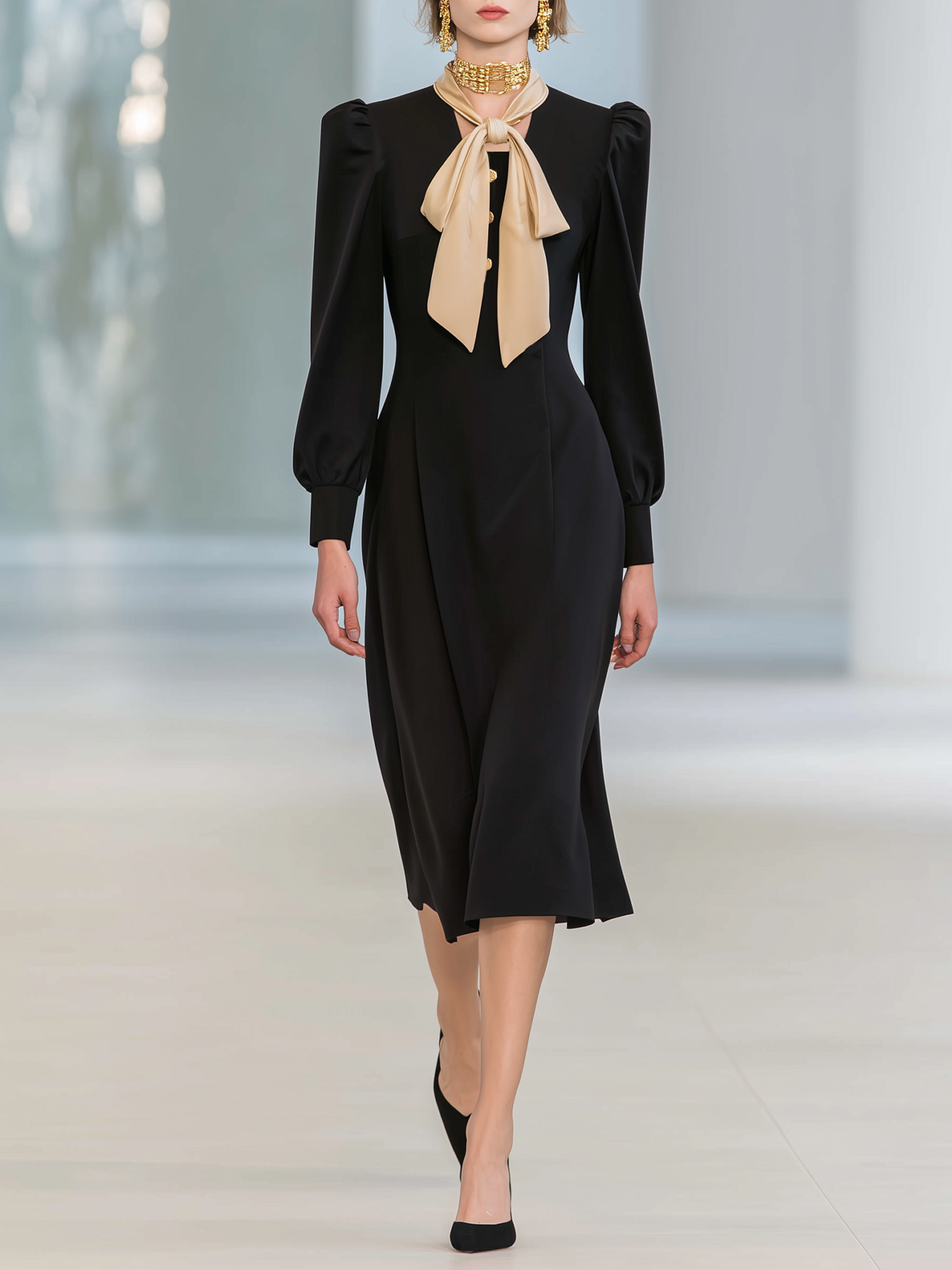 Elegant Black Long-Sleeve Midi A-Line Dress With Detachable Contrast Bow Tie For Women