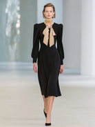 The Elegant Black Long-Sleeve Midi A-Line Dress with a Detachable Contrast Bow Tie is a versatile and timeless addition to any wardrobe. With its classic design and customizable features, it caters to various style needs and occasions, making it an essential piece for the modern woman.