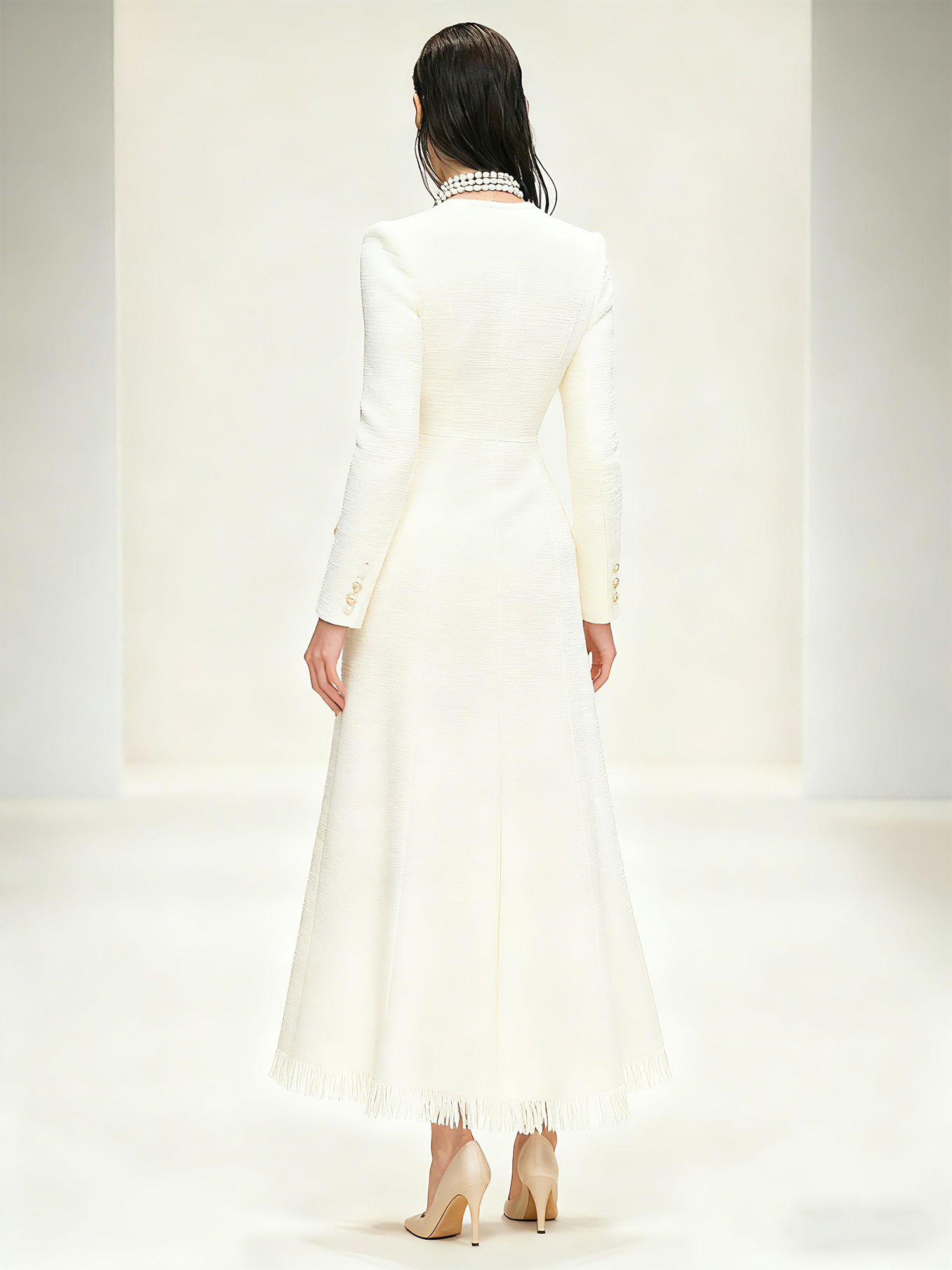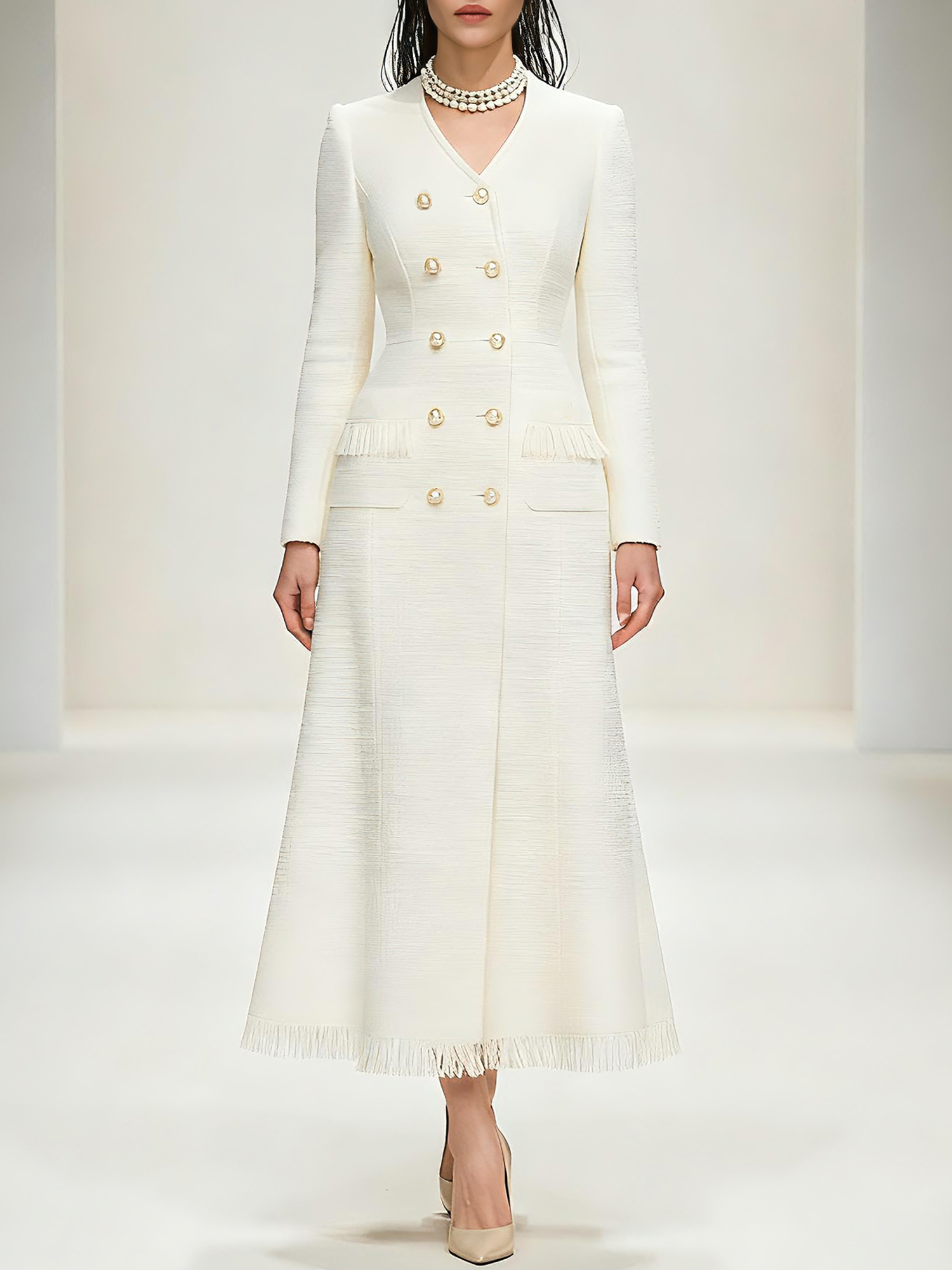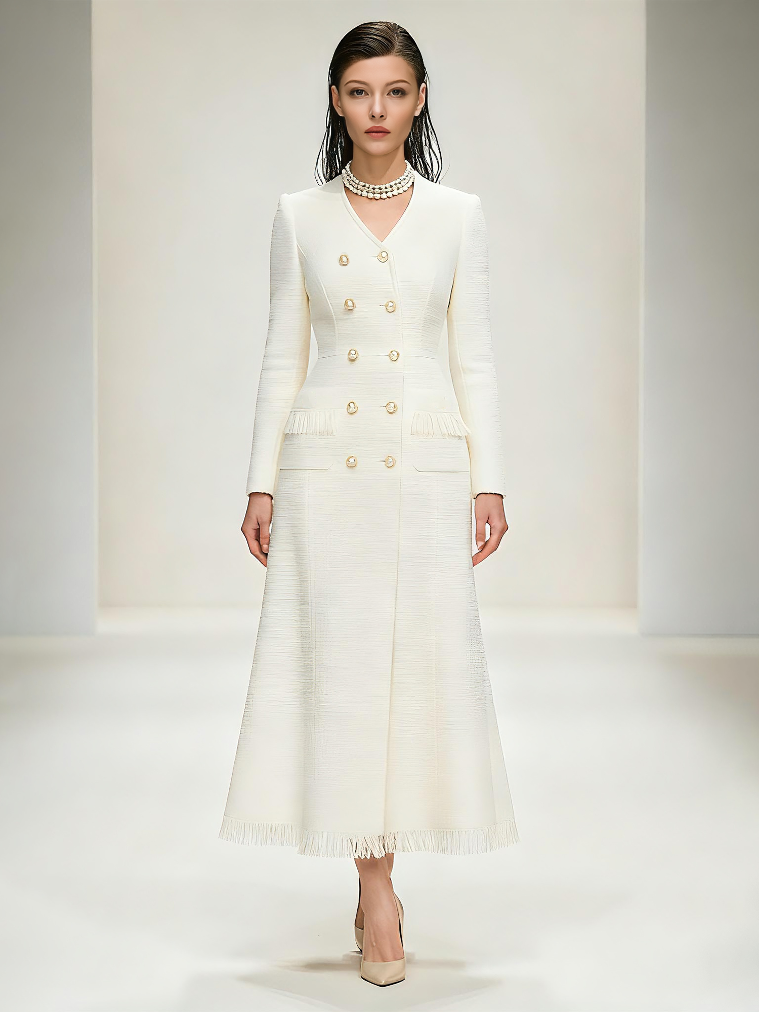 Explore the elegance of a Women's White Vintage Double-Breasted Fringe Coat designed for the socialite-chic woman who loves to make a statement at any event. This fitted long coat balances the charm of vintage styles with a modern twist, perfect for banquet coat dress occasions.
