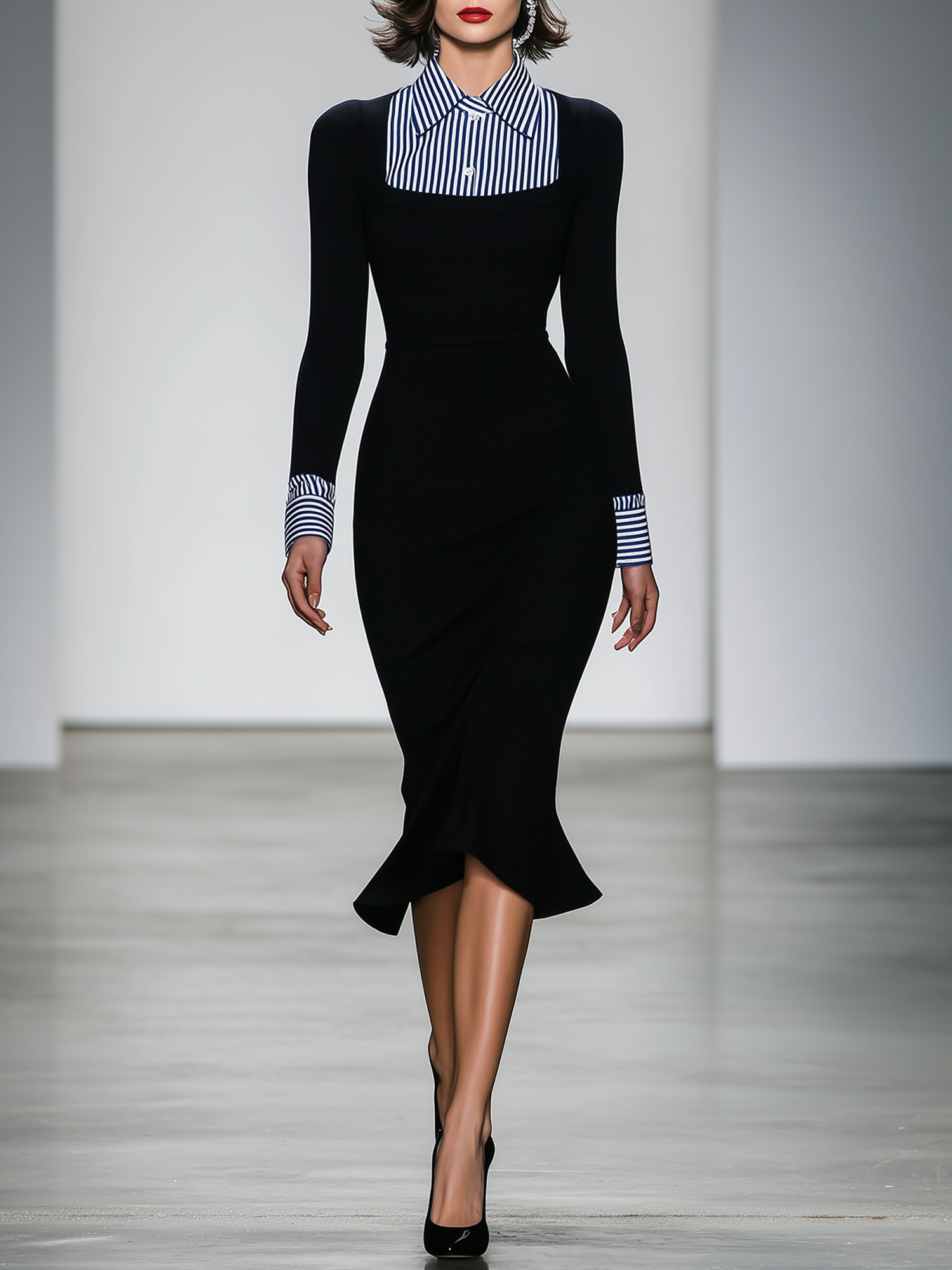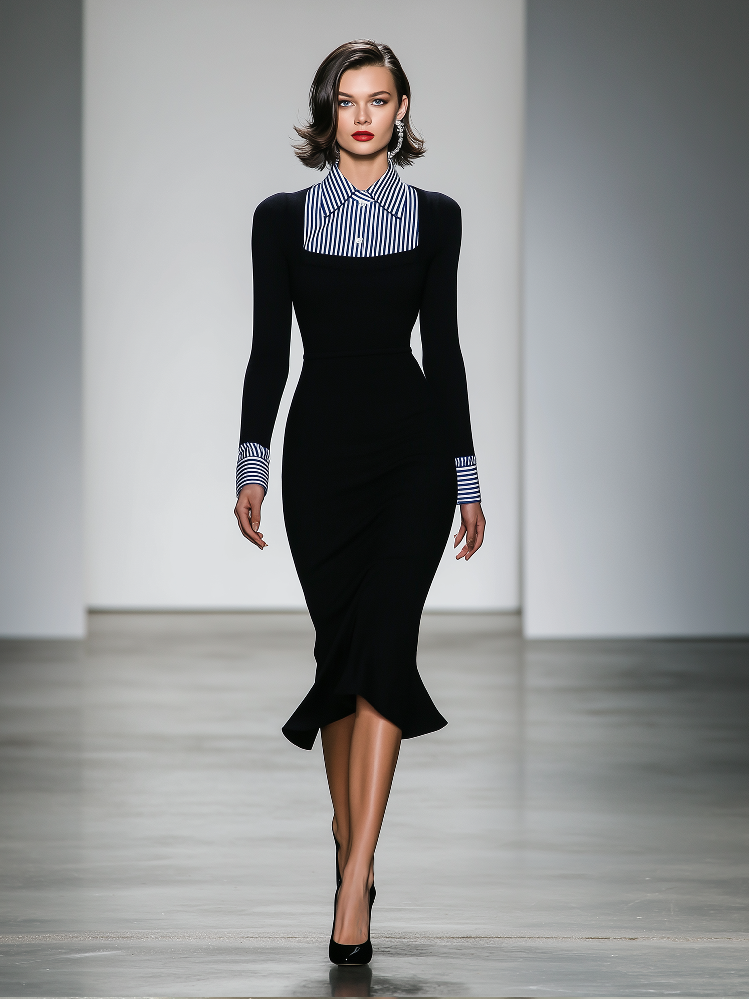 Women's Black Square Neck Striped Faux Two-Piece Bodycon Dress