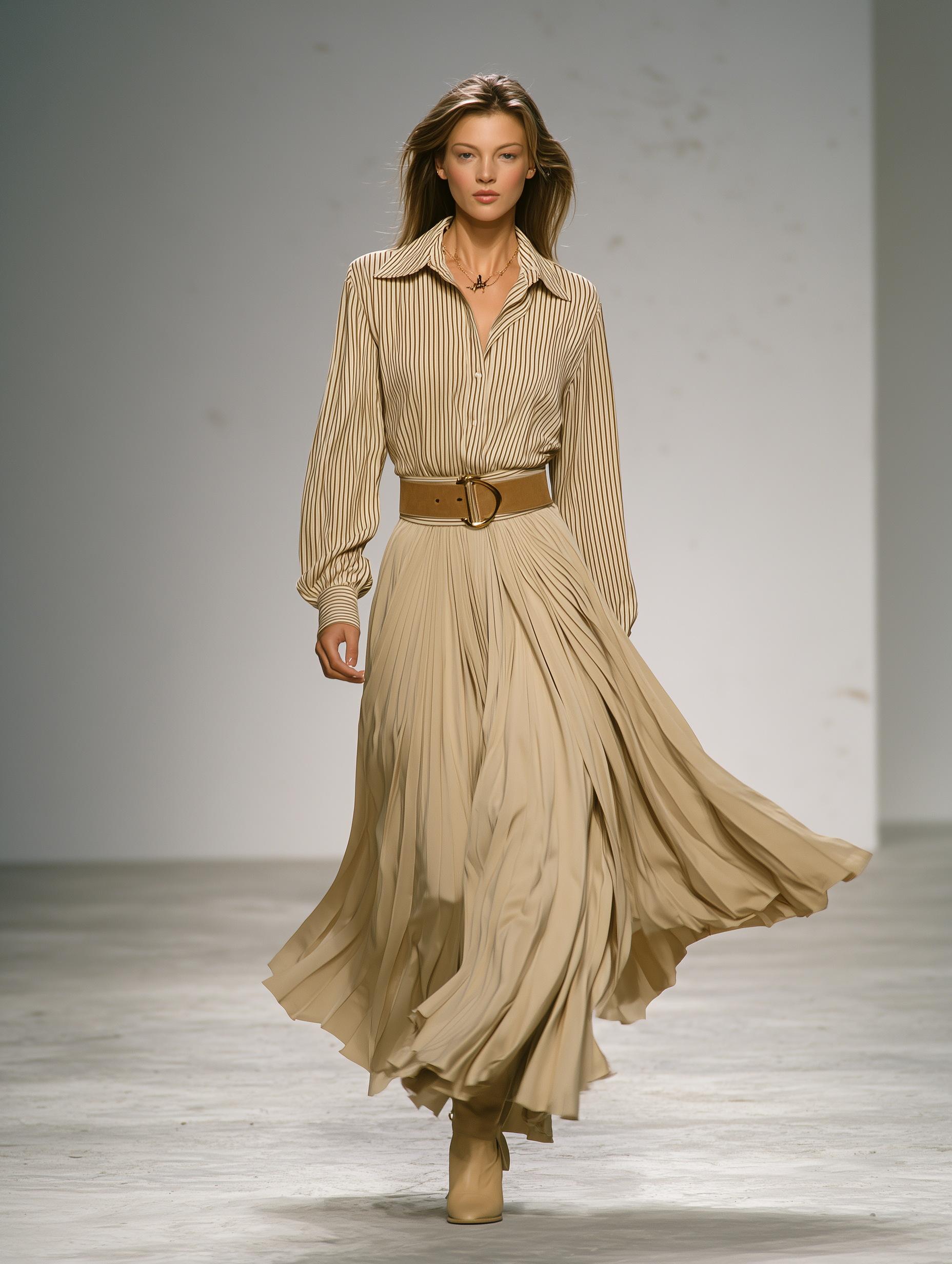 - Details: Button-down shirt with a collared neck; the skirt has a well-defined pleating pattern.