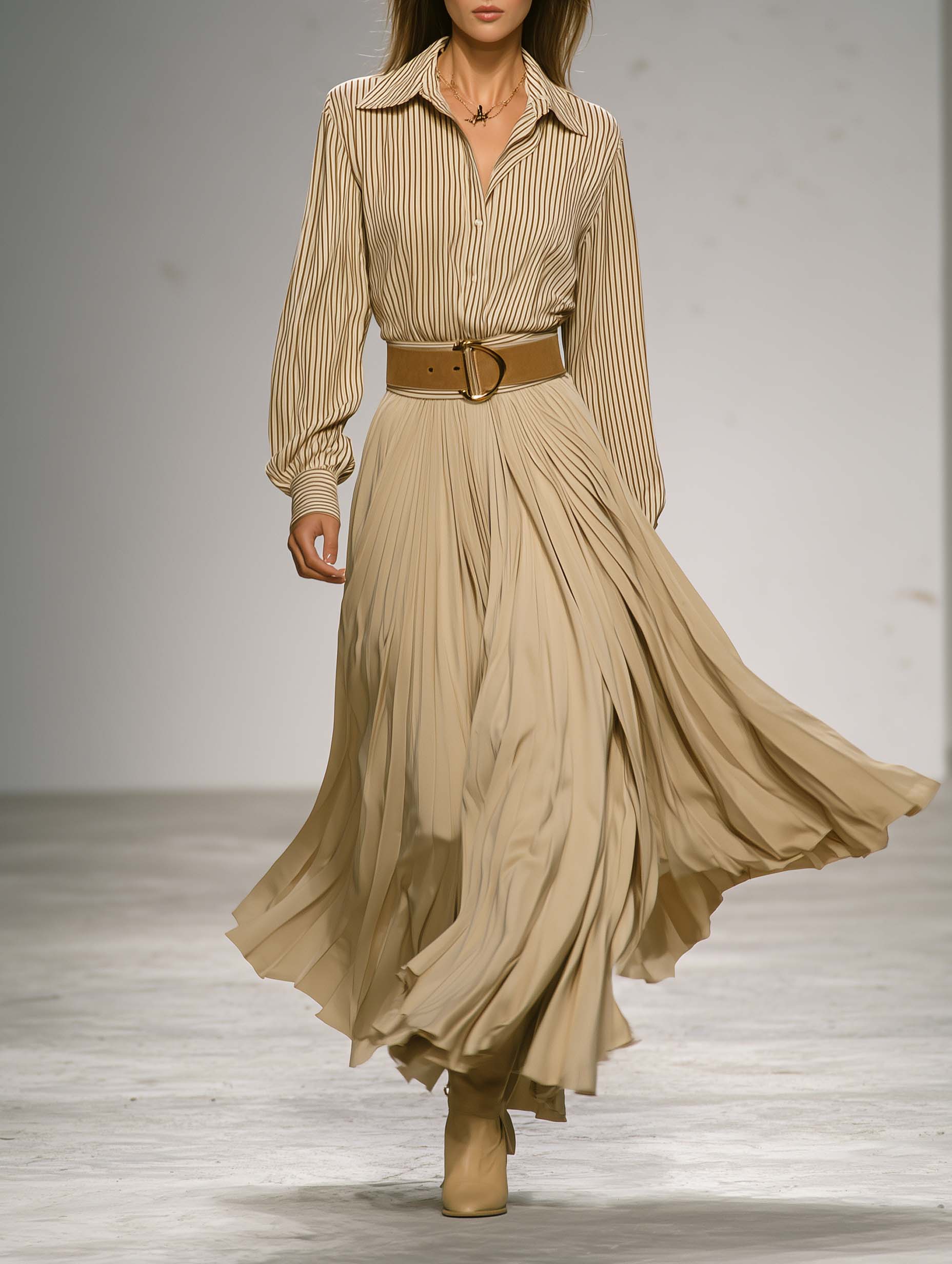 Women's Casual Khaki Shirt And Pleated Skirt Set