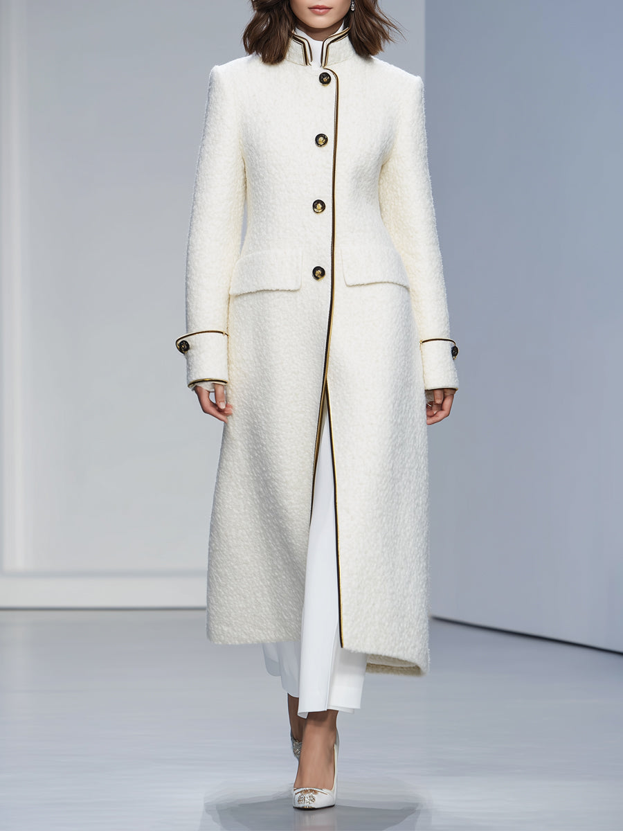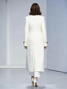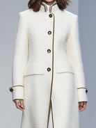 The Women's Casual Piping Embellished Ivory Loose Fit Woolen Coat is the perfect blend of comfort, style, and functionality. Its timeless design and unique detailing make it a standout piece that can elevate any outfit. Whether you're strolling through the city or heading to a social event, this coat offers versatility and an effortlessly elegant look.