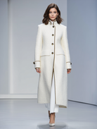 This ivory woolen coat is incredibly versatile, making it an ideal piece for a variety of looks. Pair it with black skinny jeans and ankle boots for a casual day out, or layer over a formal dress for added sophistication during the evening. Add a scarf and gloves on particularly cold days to emphasize the winter-ready aesthetic.