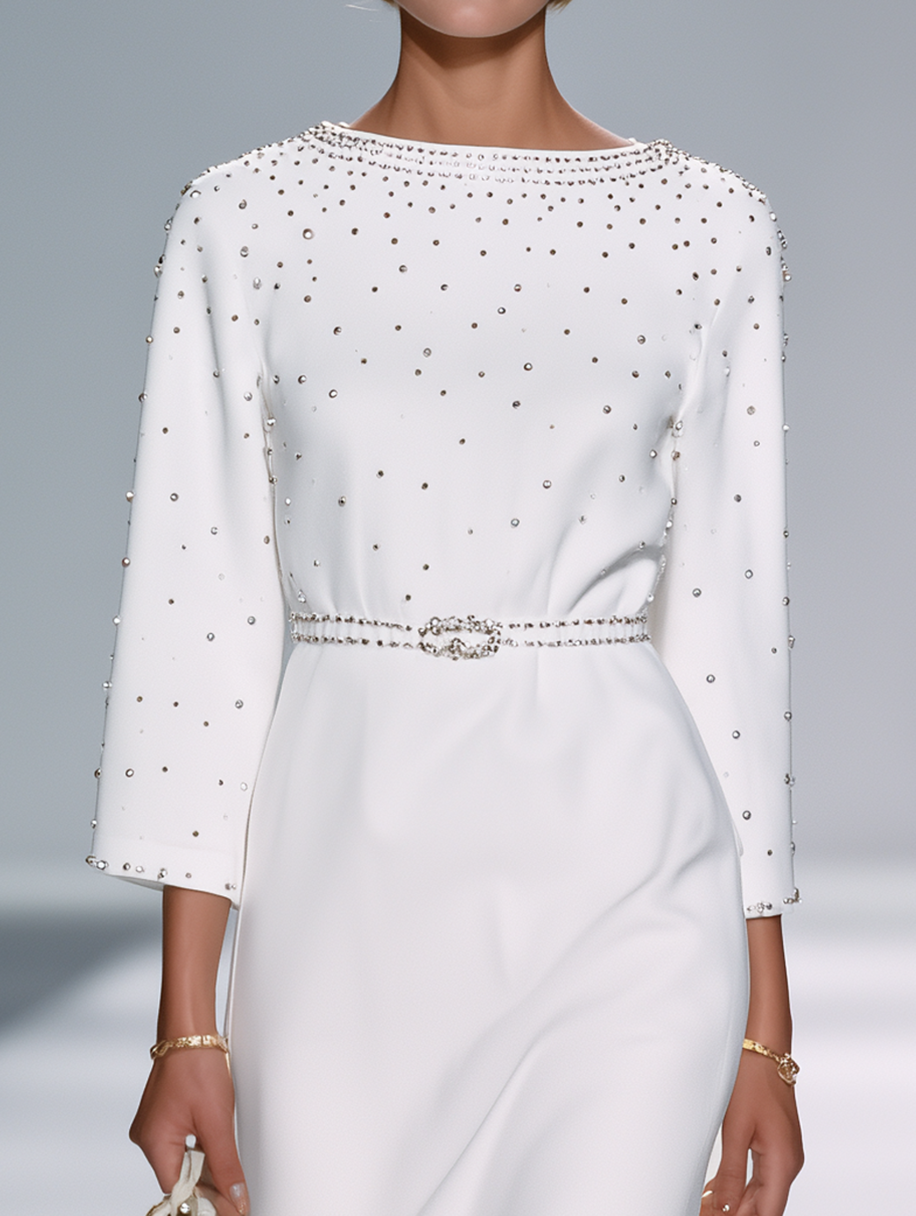 Women's Elegant Evening White Beaded Three-Quarter Sleeve Midi Dress