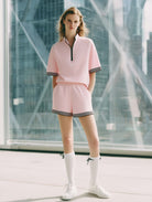 A modern two-piece casual set in a soft, sporty pink—featuring a short-sleeve top and matching shorts designed for everyday comfort and on-the-go style. The clean lines and minimalist sporty vibe make this set perfect for lounging, light workouts, errands, or casual outings when you want a coordinated, effortless look.