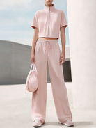 Women's Fashionable and Casual Pink Half-zip Short-sleeved Top and Wide-leg Pants Set