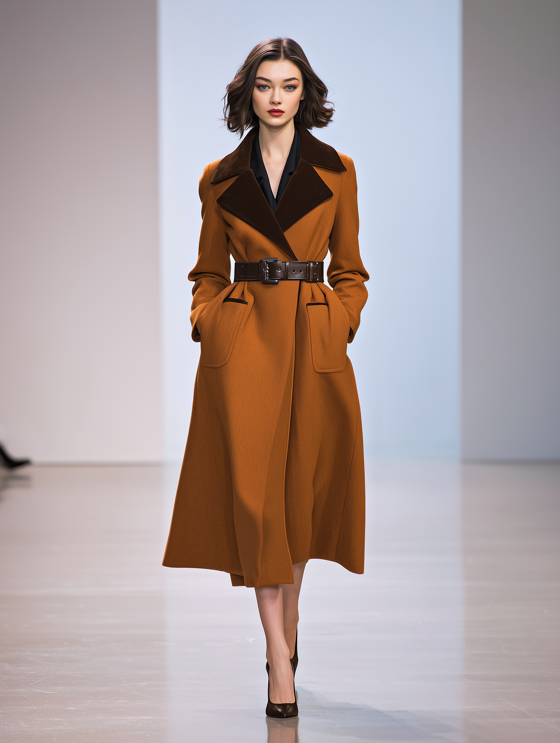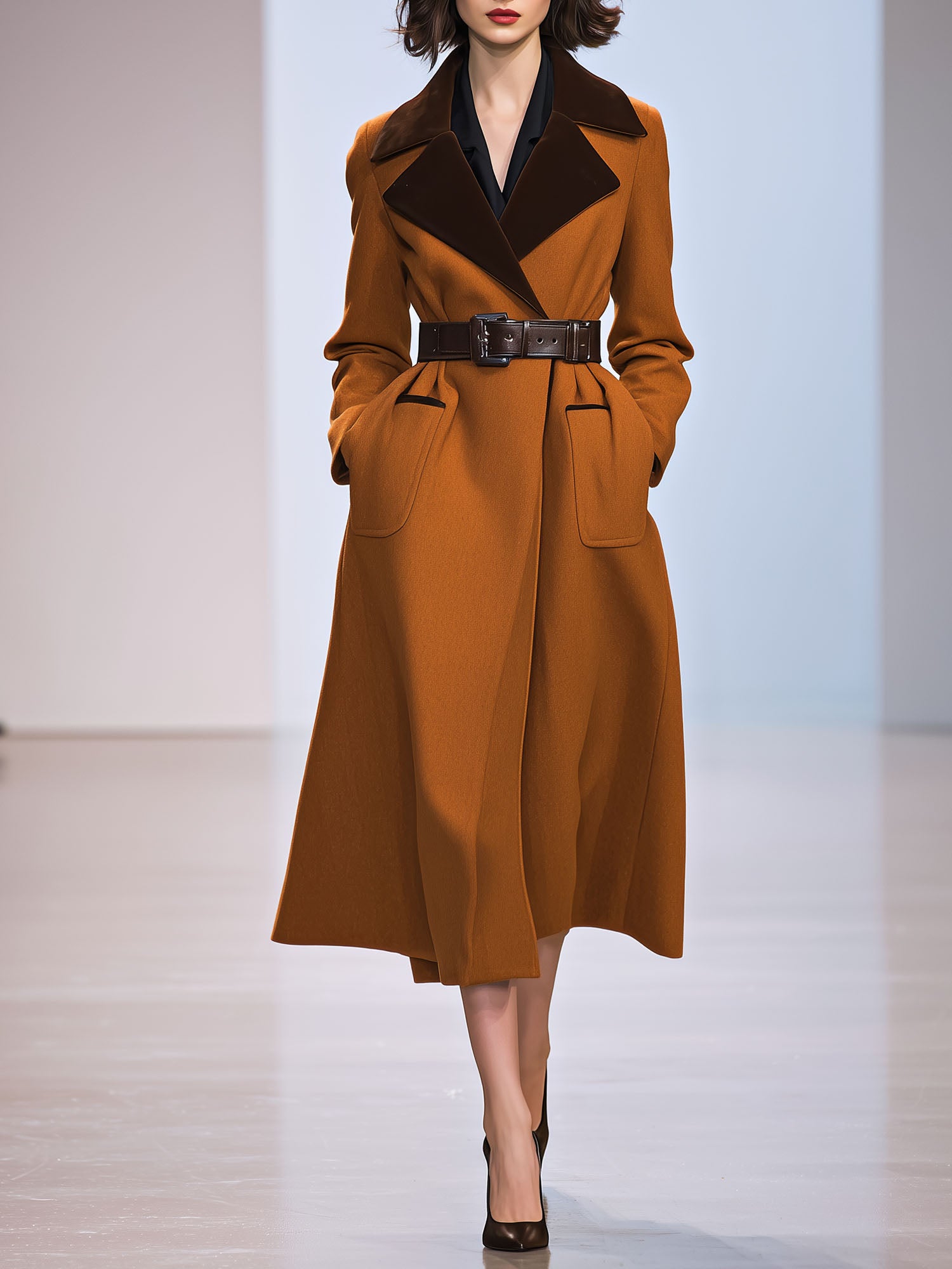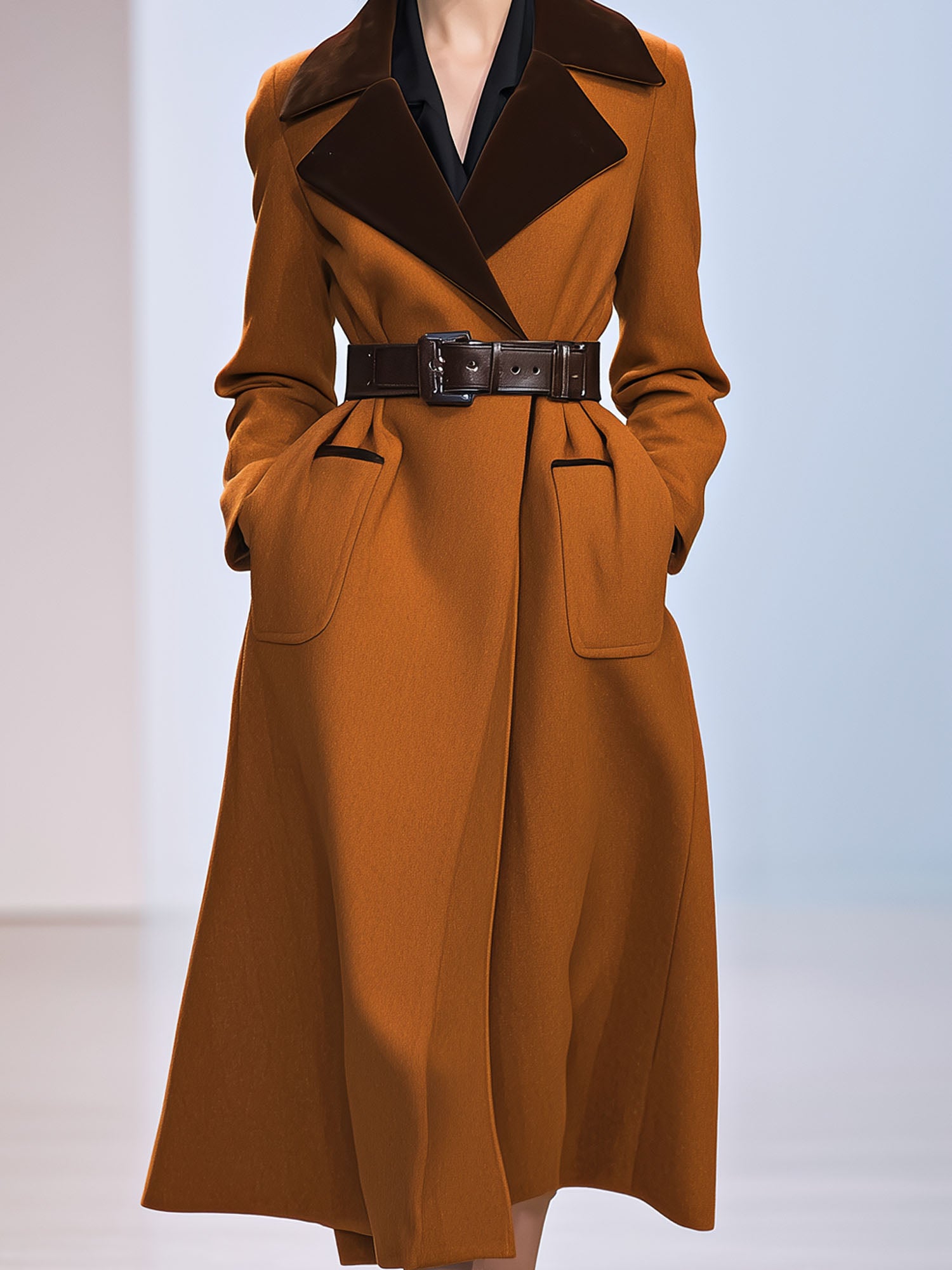 Women's Fashionable And Elegant Belted Waist Patchwork Velvet Lapel Caramel-colored Wool Coat