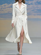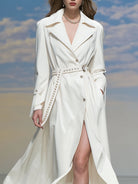 Women's Fashionable And Elegant Rhinestone-embellished Belt Ivory White Lapel Trench Coat