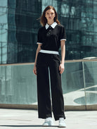 A modern two-piece set designed for effortless elegance and everyday comfort. The ensemble pairs a short-sleeved, collared top with matching high-waist pants in a clean black finish. Tailored with minimalist lines and a relaxed silhouette, this suit offers a refined casual look that transitions easily from work to weekend.