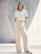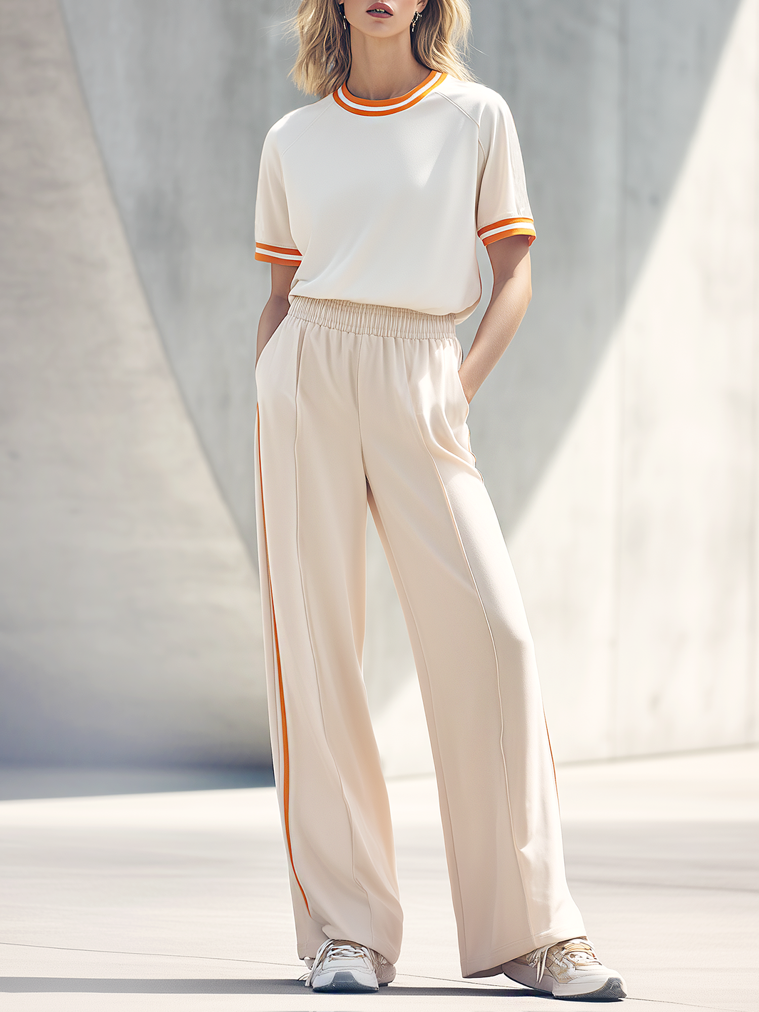 Women's Fashionable Casual White T-shirt With Orange Trim And Beige Pants Set