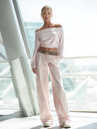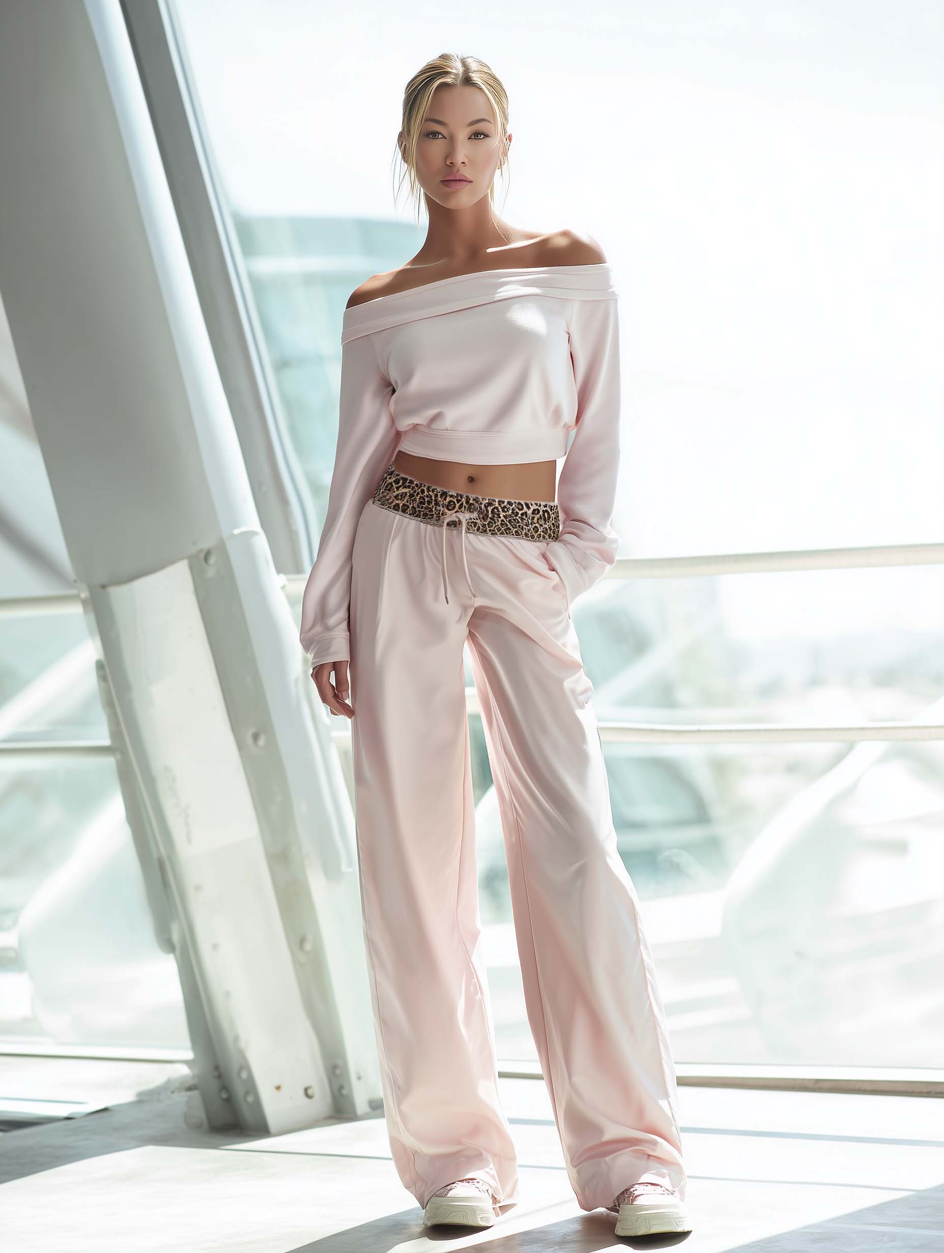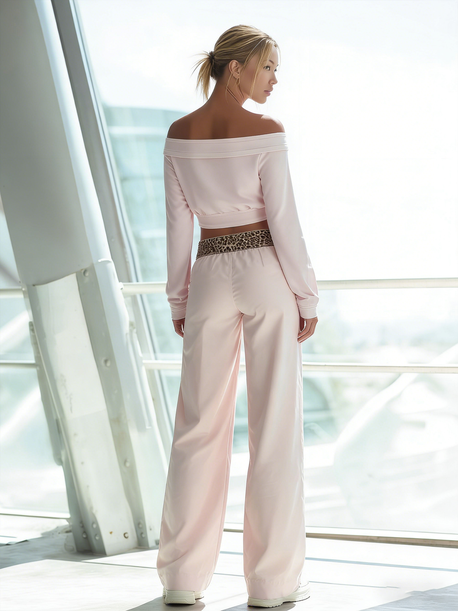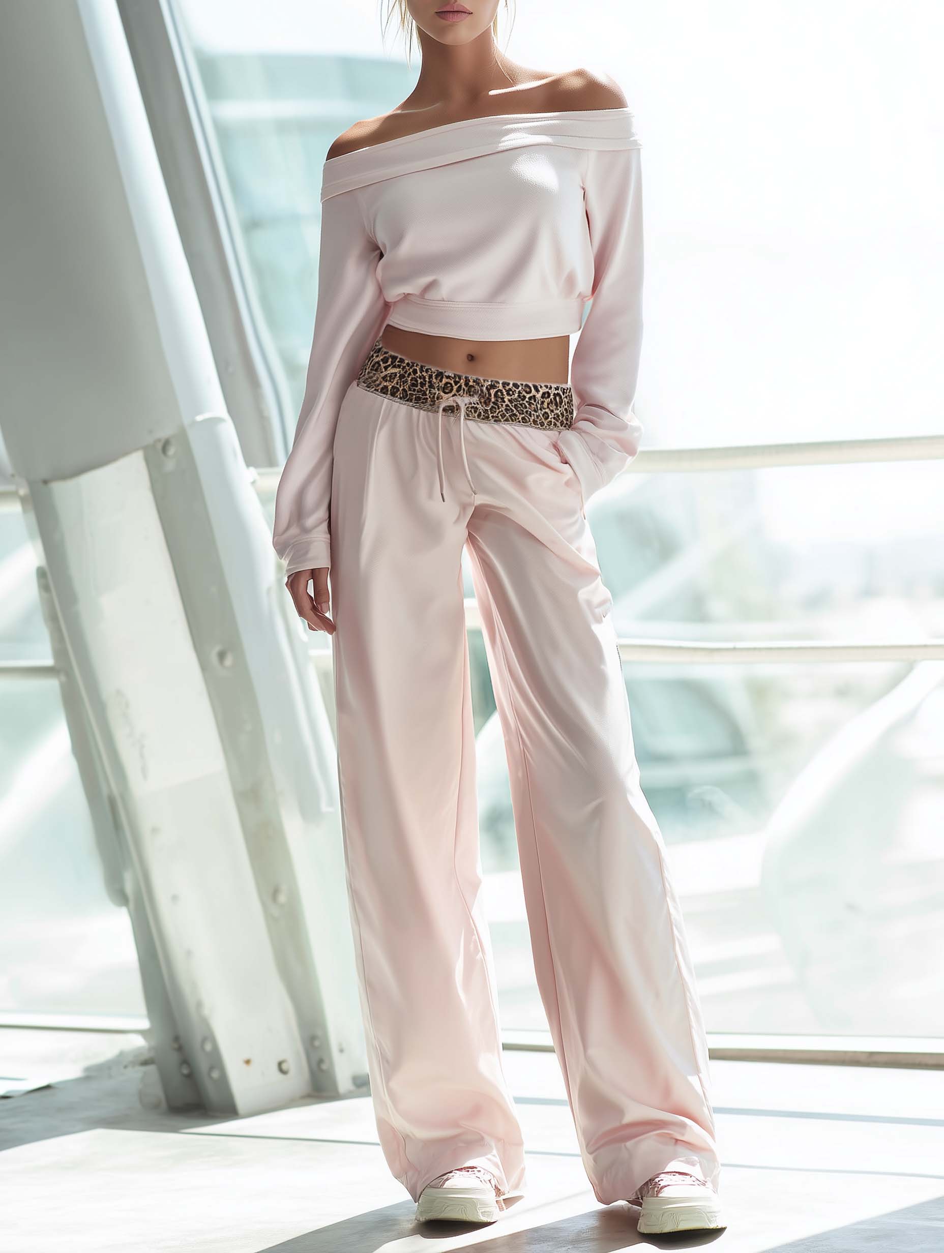 This light-pink off-shoulder top and leopard-print patchwork trousers create a balanced outfit that’s both feminine and bold. Comfortable enough for daily wear and stylish enough for social outings, this set is a versatile addition to a modern wardrobe—mix and match pieces as desired to extend its wearability.