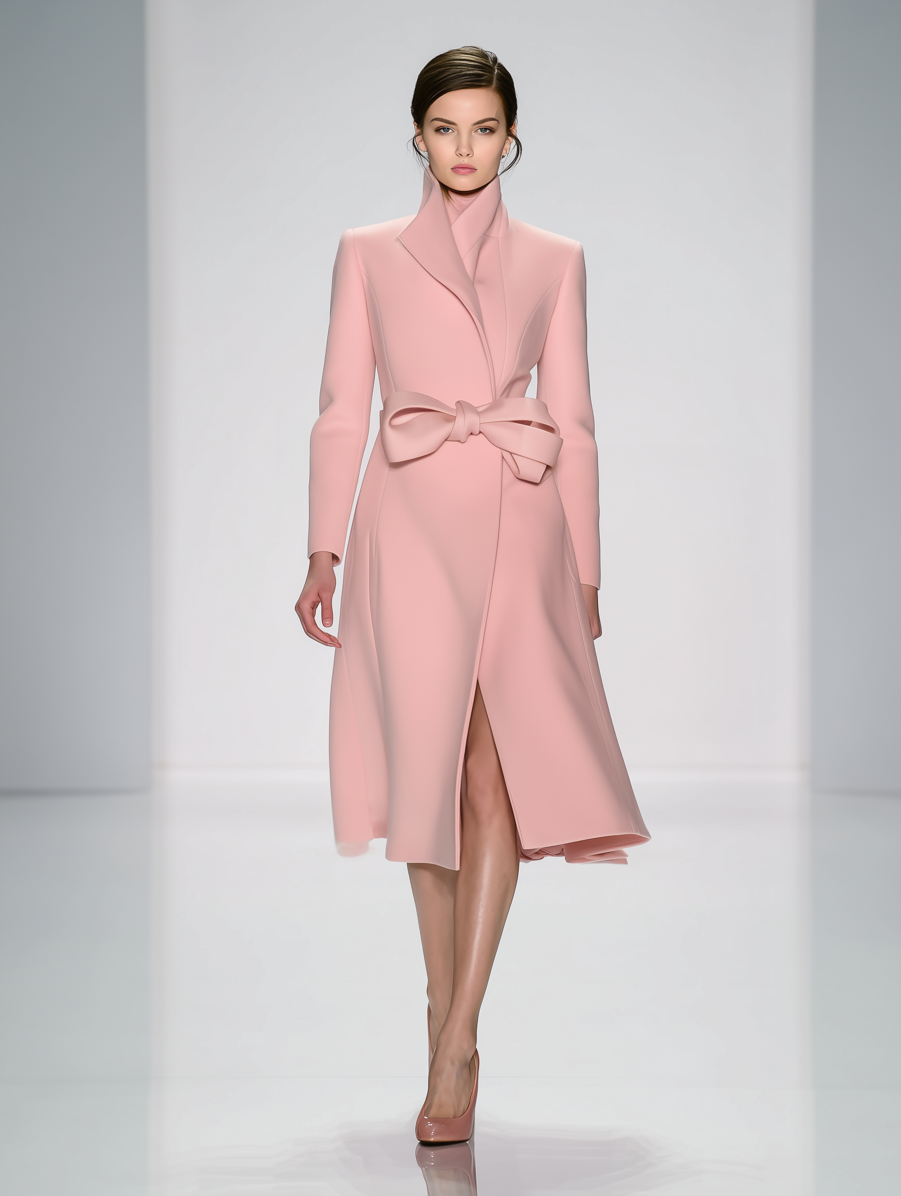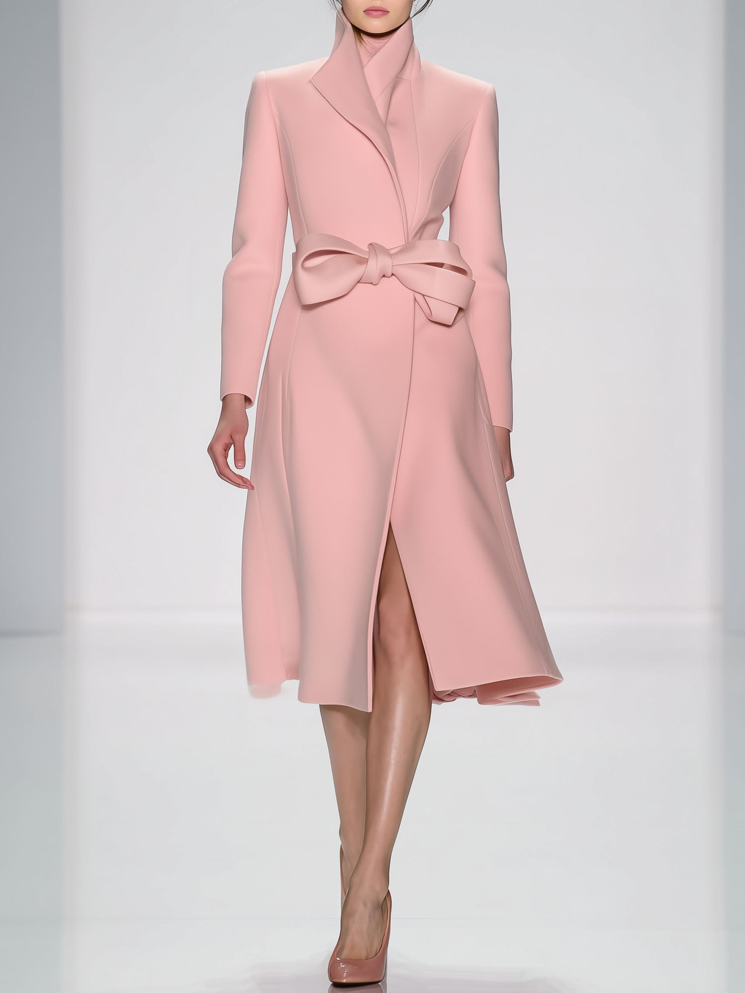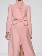 This fashionable pink wool coat is designed for women who appreciate elegance and comfort. Featuring a sophisticated bow front and hidden buttons, this coat is a perfect addition to any fashion-forward wardrobe. The stand-up collar offers a chic touch while providing additional warmth and coverage in colder months.