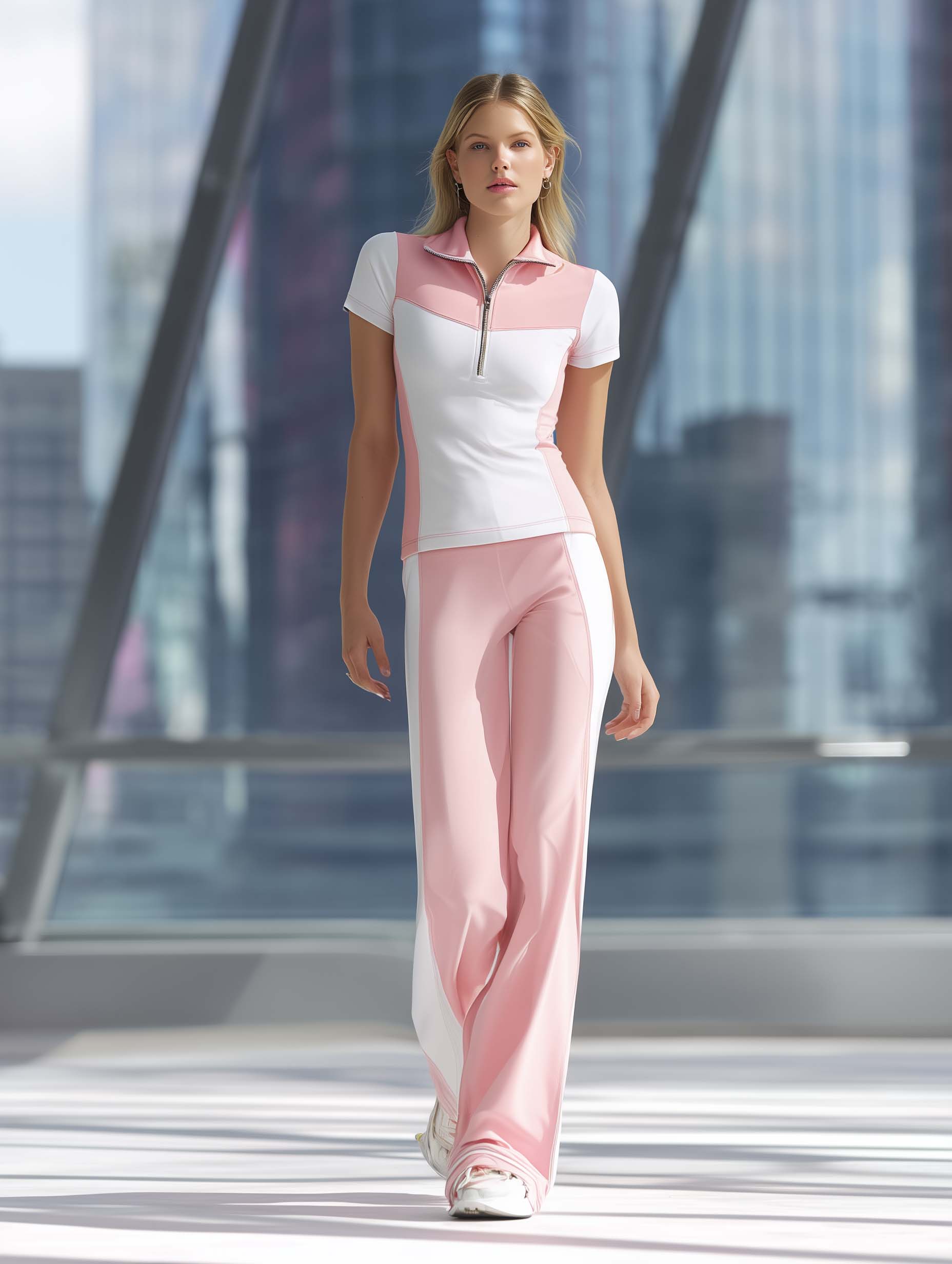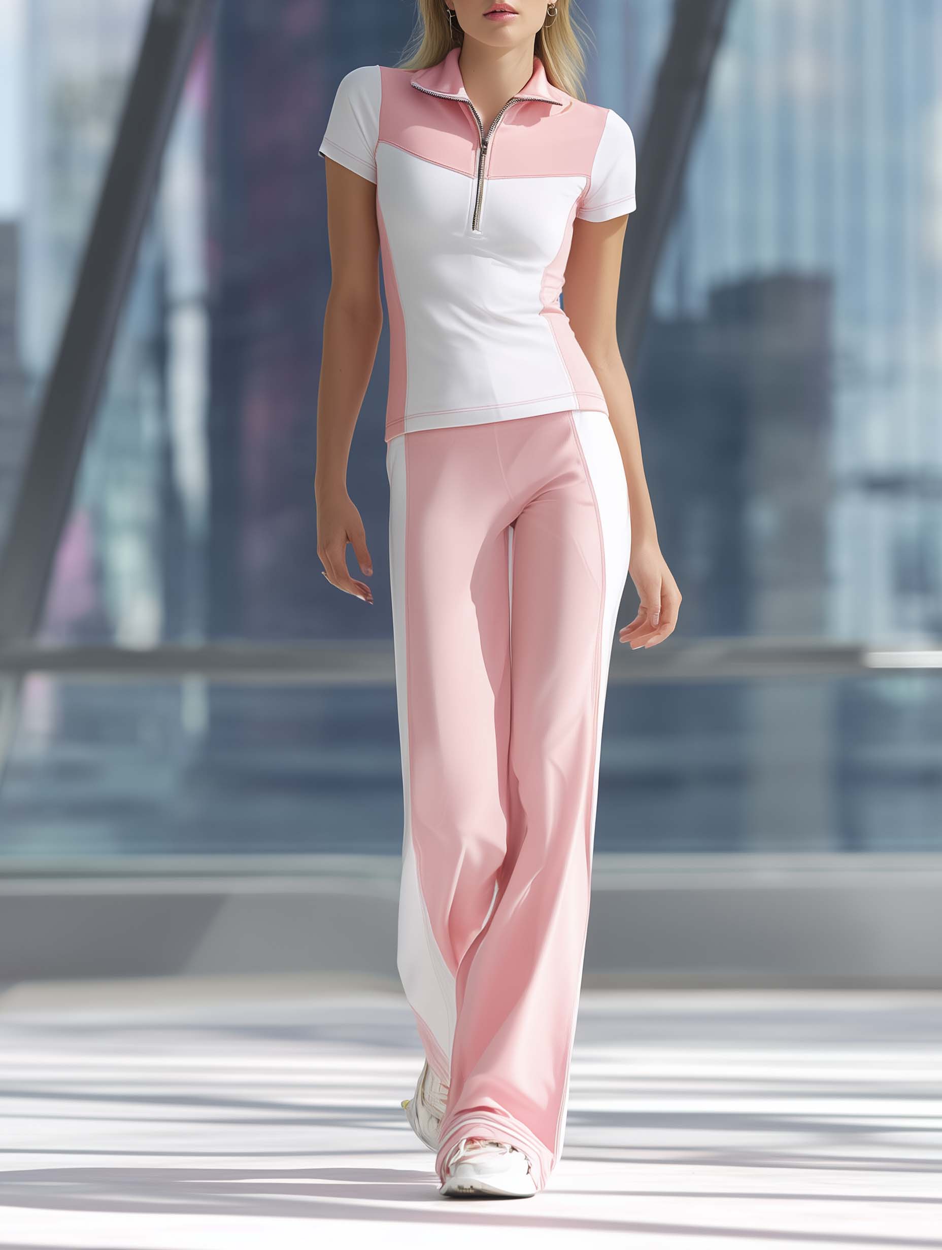 This pink-and-white color-block casual suit blends sporty functionality with contemporary style. Comfortable, versatile, and flattering, it’s a go-to option for active weekends, travel, or laid-back city looks. An easy-to-wear set that offers multiple styling possibilities while keeping comfort front and center.