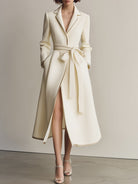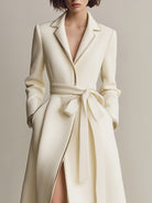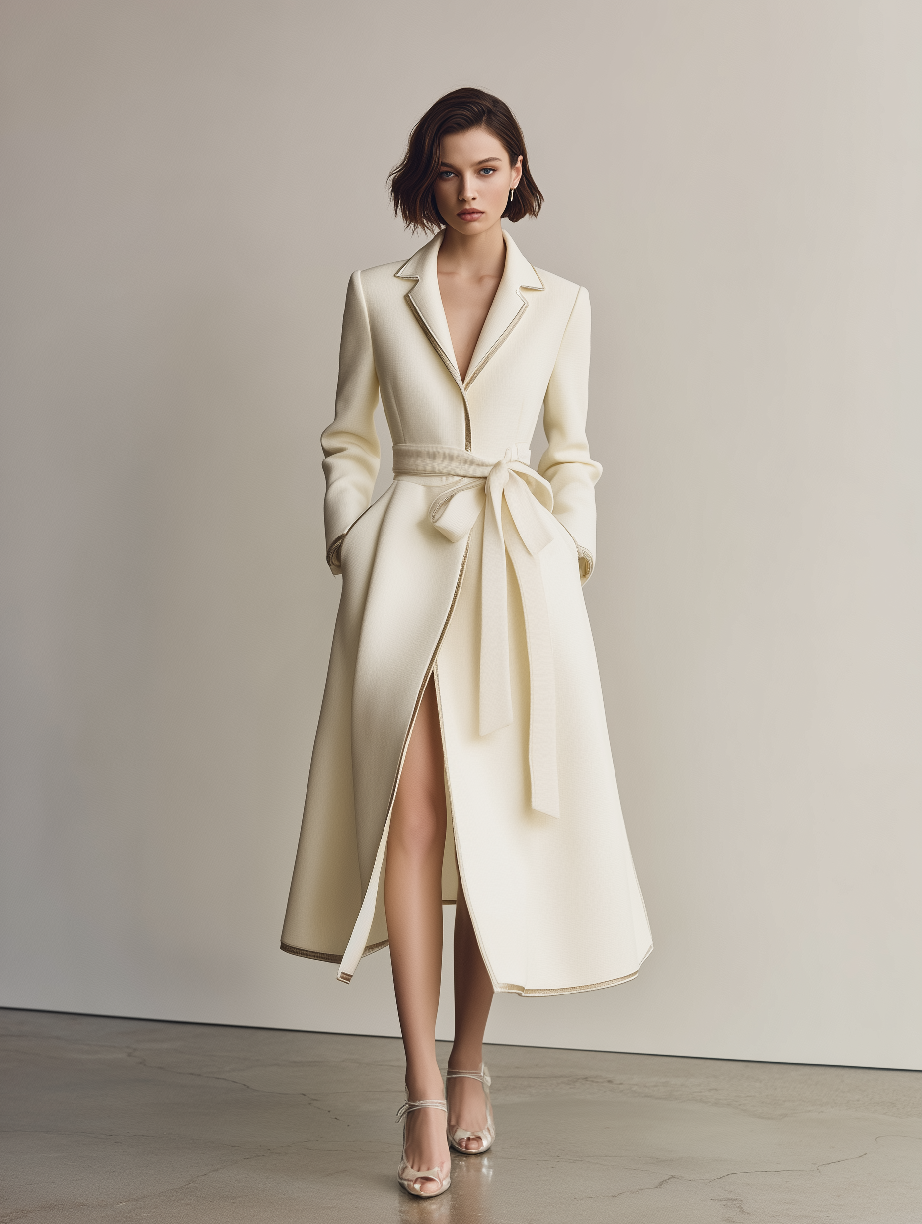 The Women's Ivory Wrap-style Wool Coat with Gold Ribbon Trim and Cinched Waist is an exquisite piece that blends style, comfort, and elegance. Its versatile design makes it an essential coat for any occasion, ensuring you stay warm while looking effortlessly sophisticated.