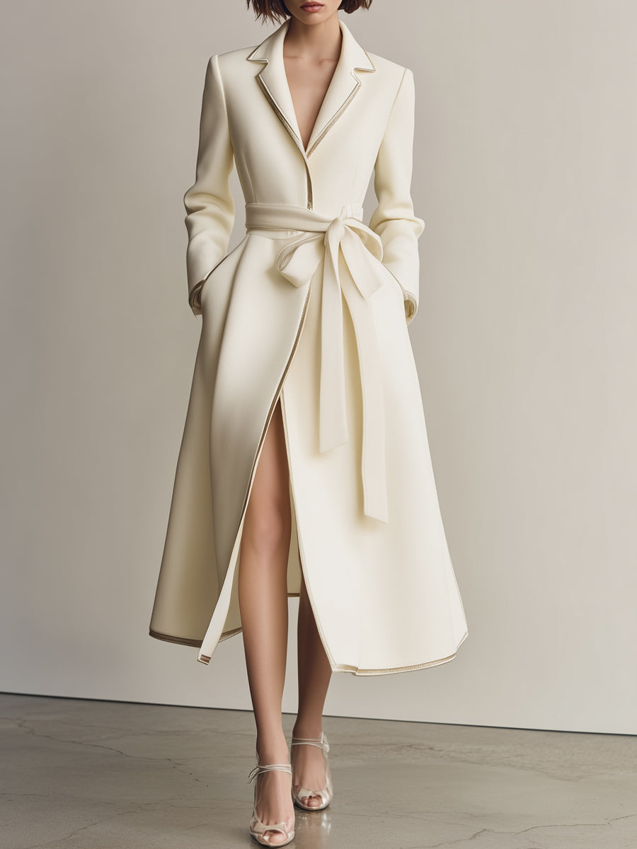 Women's Ivory Wrap-style Wool Coat With Gold Ribbon Trim And Cinched Waist