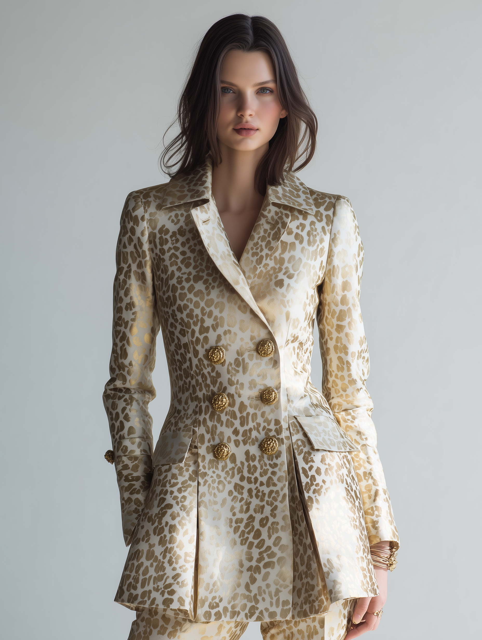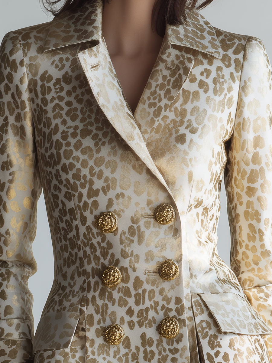 Pair this chic leopard print jacket with a solid color top to balance the bold pattern. For a more refined look, wear it with tailored trousers or a pencil skirt. Add heels or ankle boots to complete the ensemble. Accessories can include a simple clutch and minimalistic jewelry to keep the focus on the jacket.