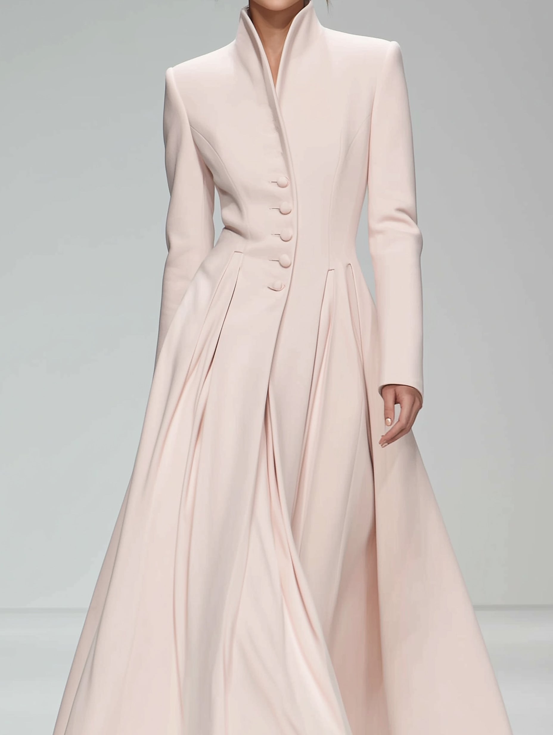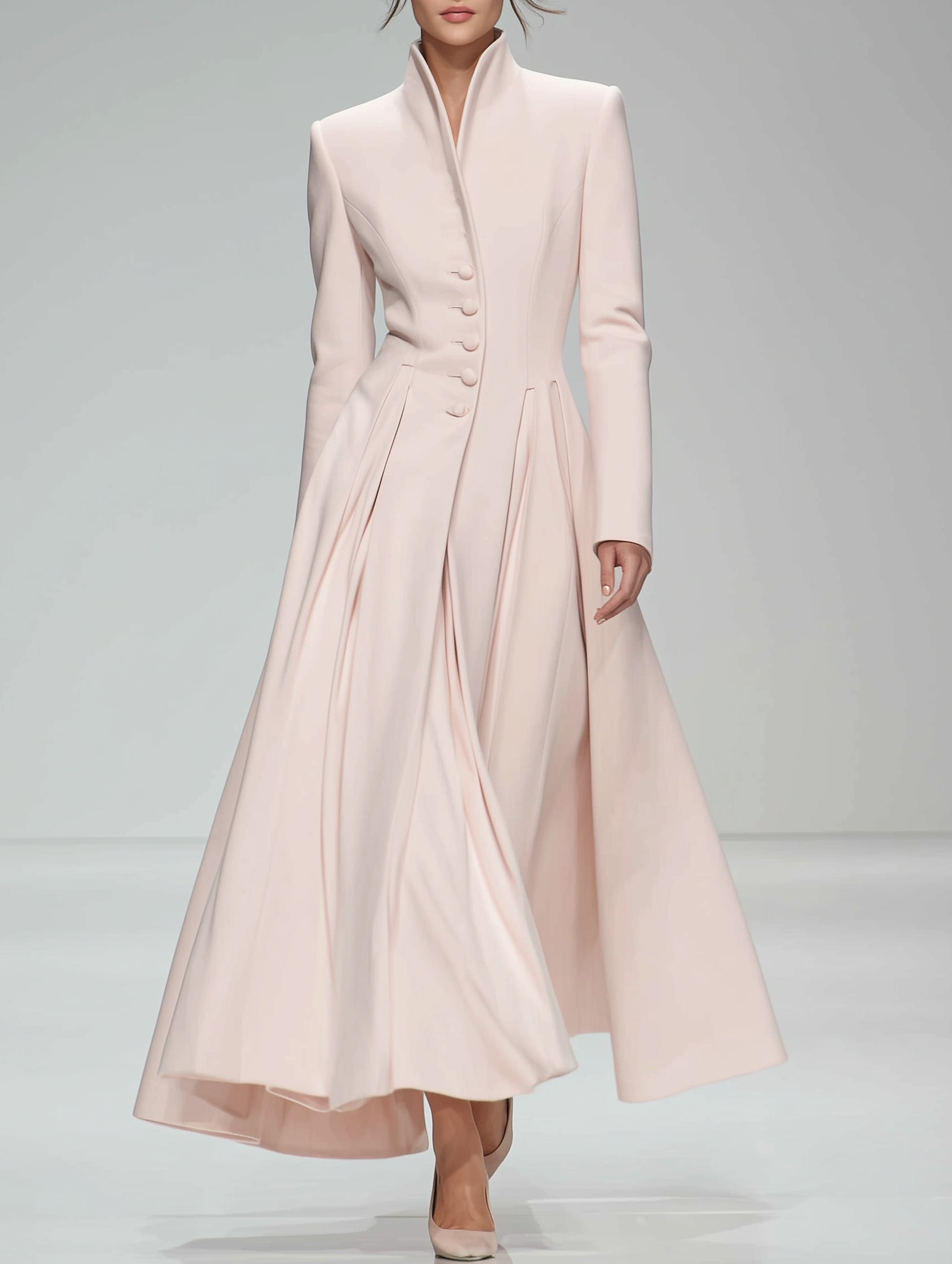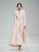 Women's Light Pink Stand-up Collar Fitted Waist Pleated Long Elegant Wool Coat