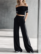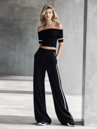 Women's Off-Shoulder Knit Set: Short Crop Top + Side-Striped Wide-Leg Pants