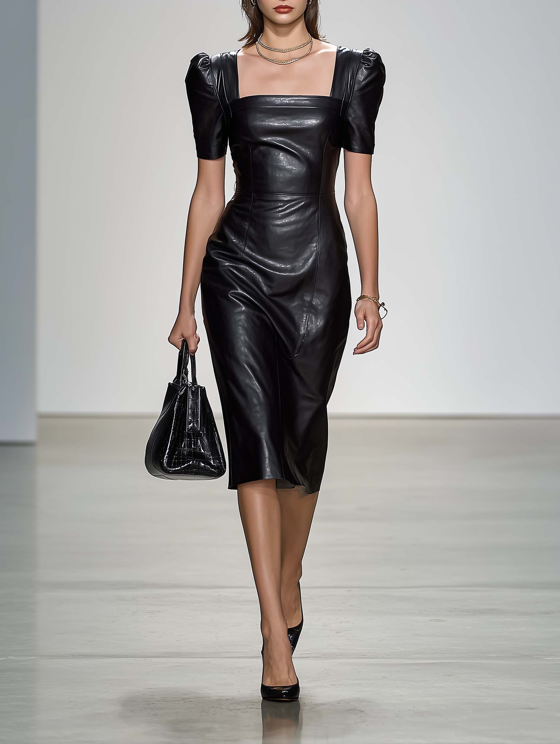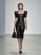 Introducing the Women's Puff Sleeve Square Neck Black Leather Skirt, a standout piece for the modern fashion-forward woman. The design seamlessly blends classic elegance with a touch of boldness, making it a versatile addition to your wardrobe.