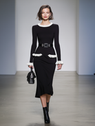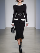 This Women's Black And White Color-blocked Dress is a beautiful blend of retro elegance and modern sophistication. Designed for the stylish commuter, this bodycon midi skirt features long sleeves and a waist-cinching metal buckle belt that emphasizes an hourglass figure. The dress finishes with a graceful fishtail skirt that adds a touch of femininity to its structured silhouette.