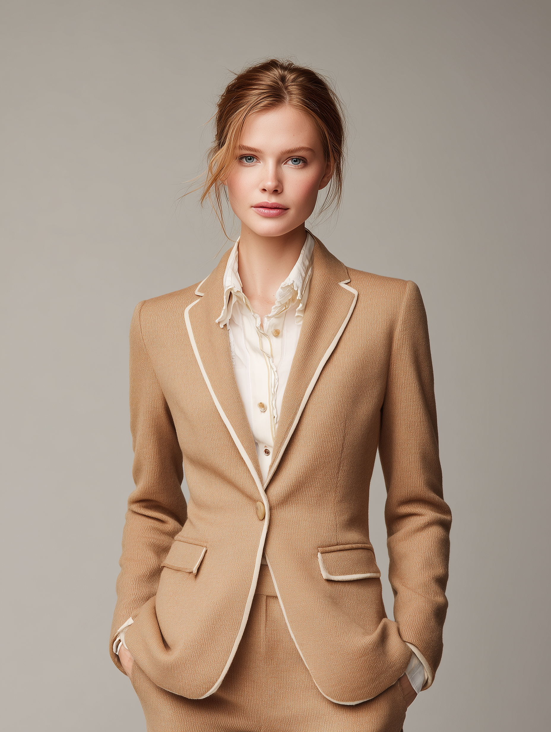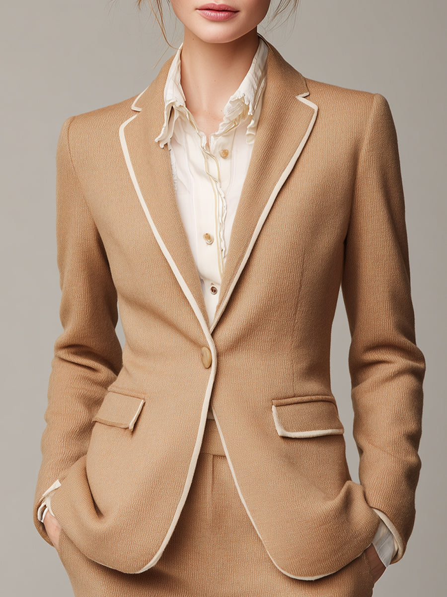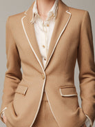 Women's Simple Beige Piping And Khaki Wool Suit Jacket
