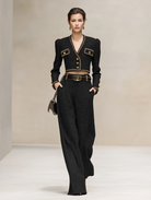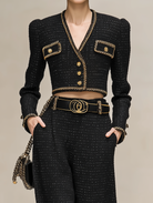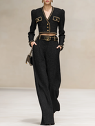 The Women's Black Tweed Suit is a sophisticated and elegant two-piece set that includes a short jacket with a distinctive gold chain trim and high-waisted wide-leg pants. This ensemble is designed to provide a polished look suitable for banquets and daily commutes, offering a beautiful blend of style and practicality.