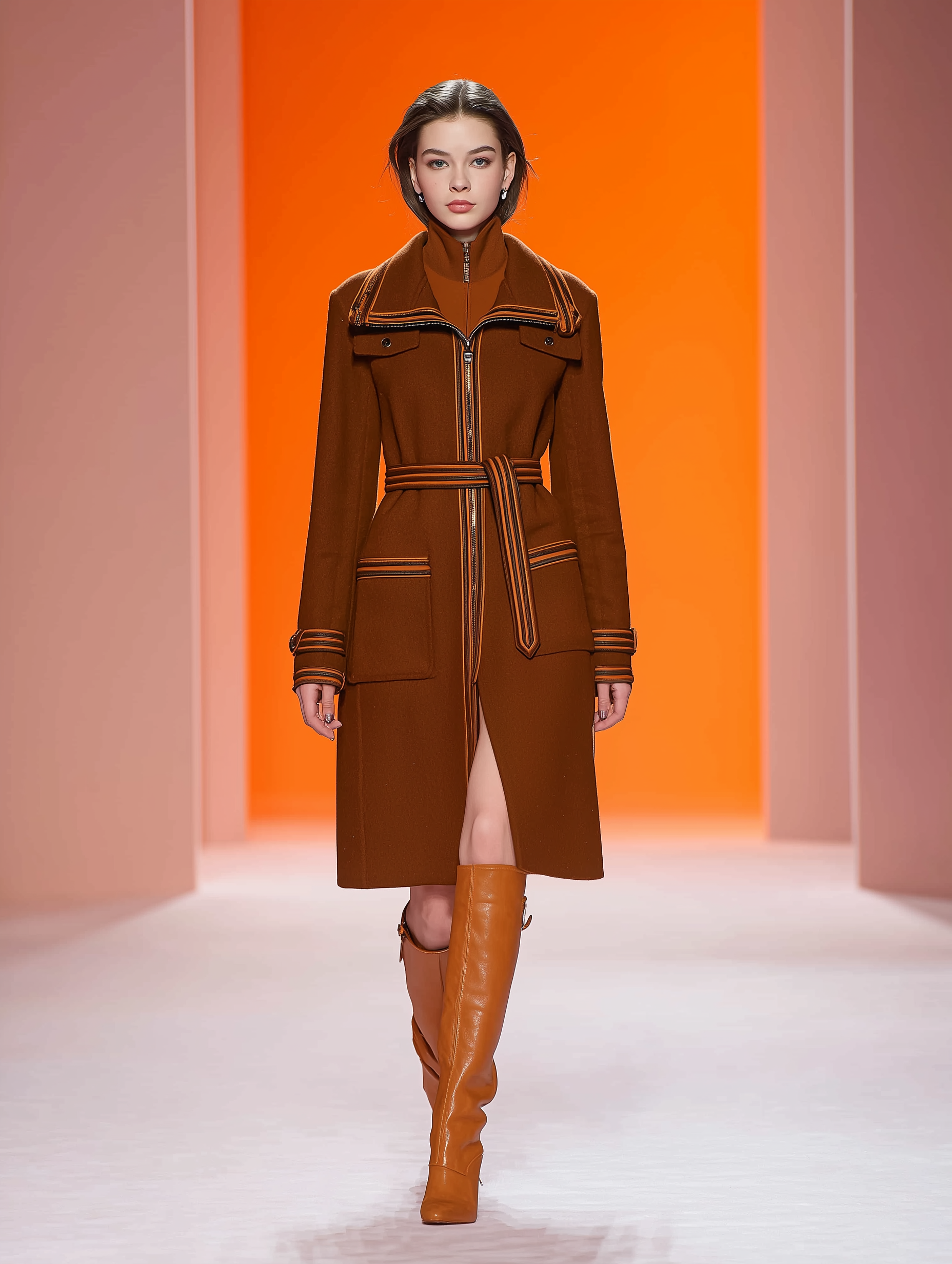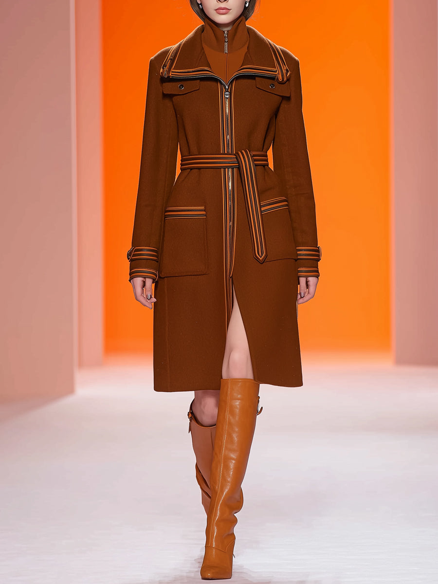 Women's Fashionable Caramel Brown Spliced webbing Waist Large Lapel Wool Mid-length Coat