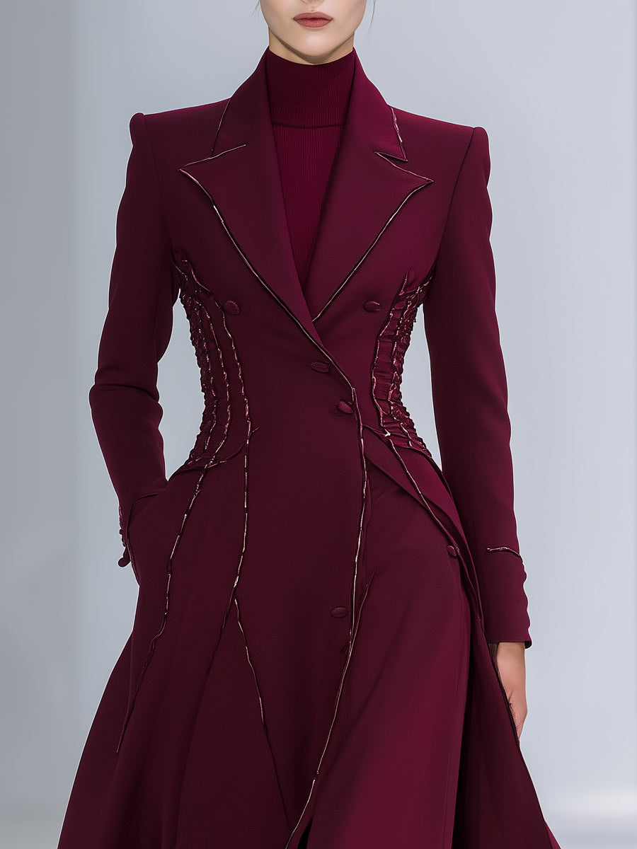 Women's Fashionable Autumn And Winter Burgundy Red Metal Embroidered Long A-line Woolen Coat