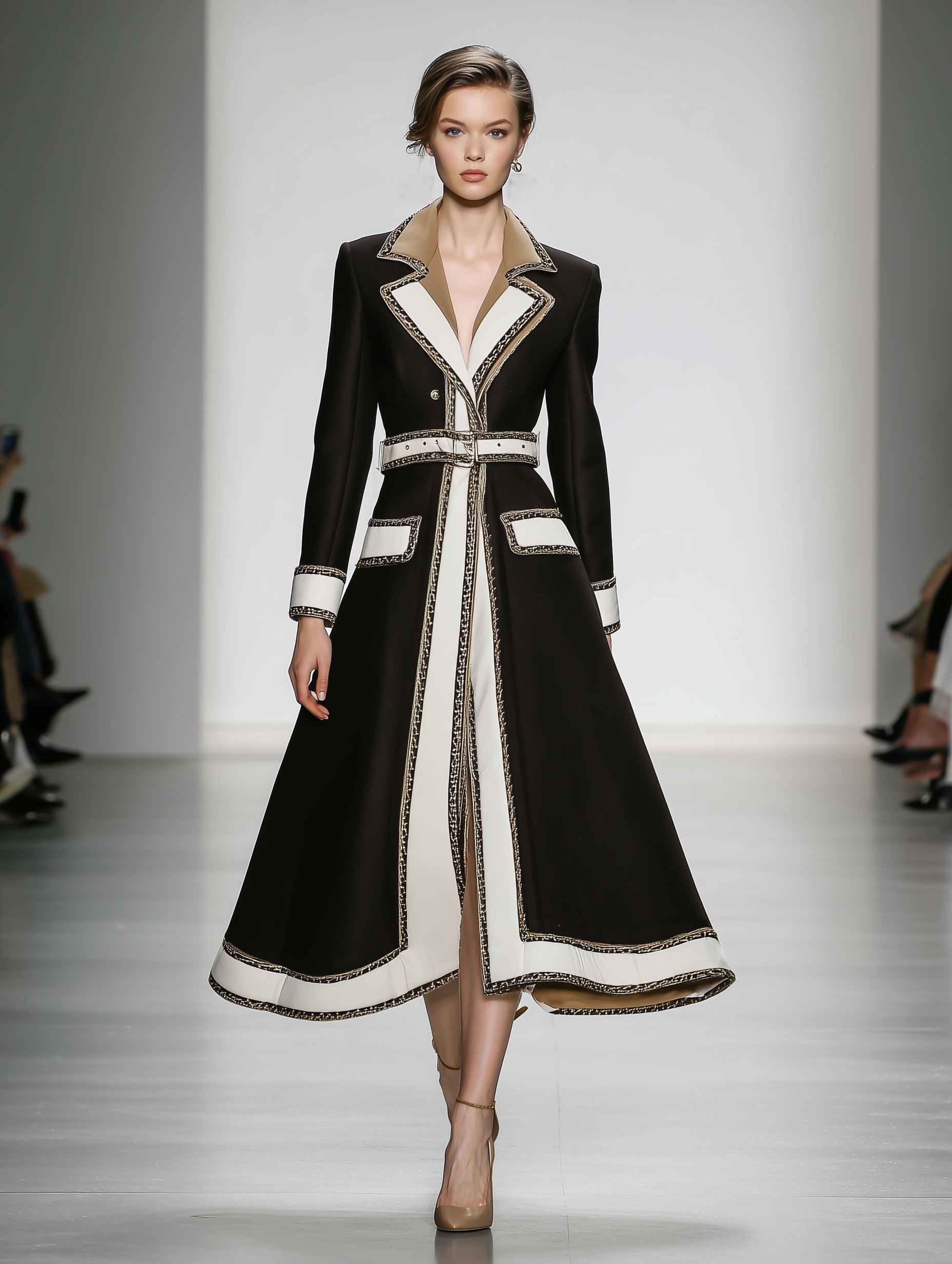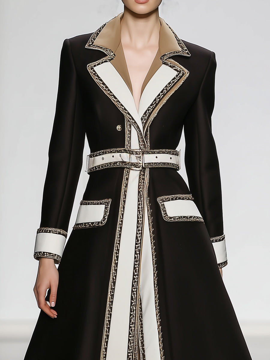Women's Fashionable Long Waist Stitched Web Contrast Navy Blue Long Coat