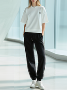 This two-piece set features a crisp white short-sleeved top with delicate embroidered detailing and a pair of classic black pants. The top offers a relaxed, modern silhouette with subtle decorative stitching that adds a feminine, refined touch. The black pants present a clean, straight profile that balances the softness of the top for a versatile everyday look.