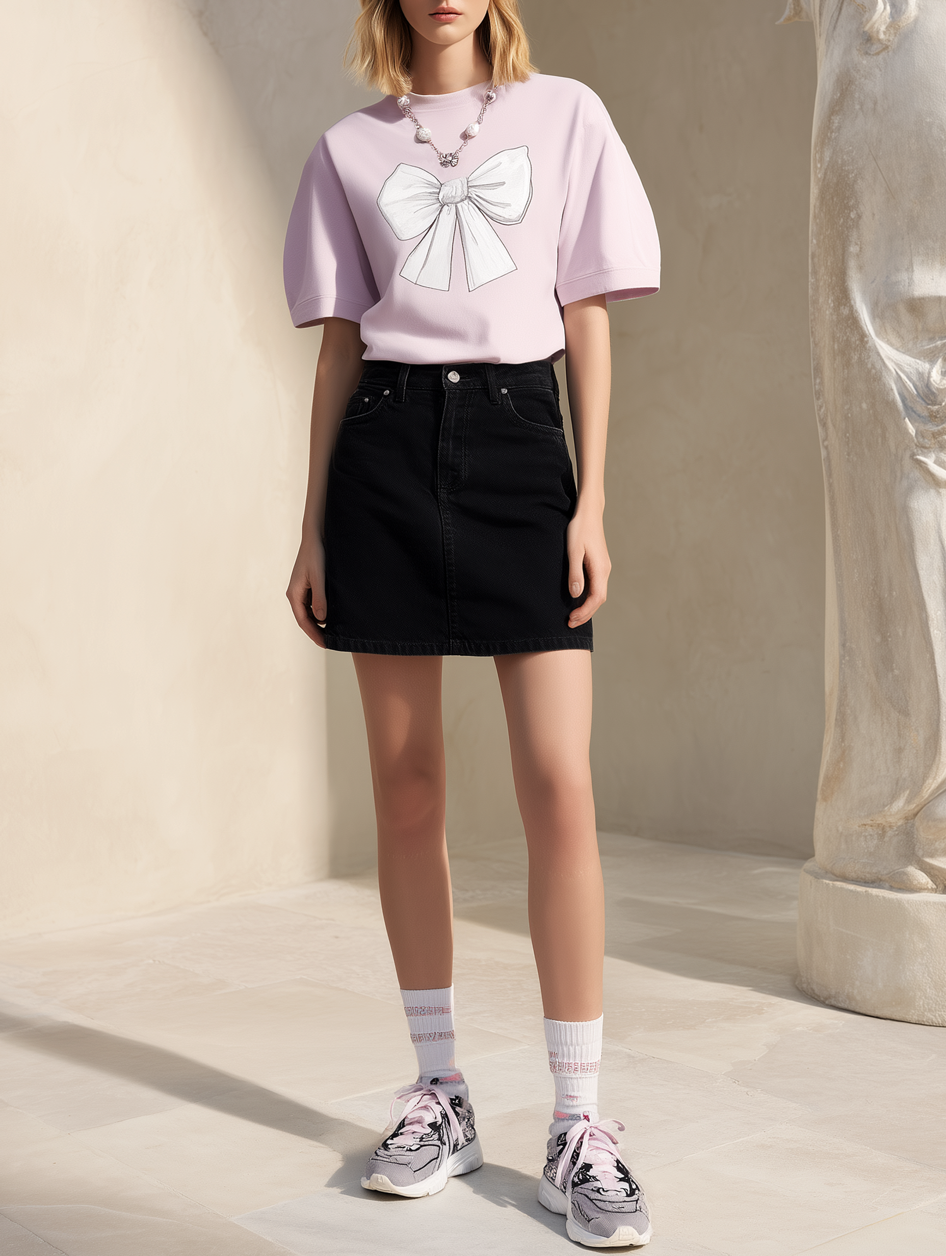 - Skirt style: Black denim mini skirt in a clean, straight silhouette that balances the softness of the tee.