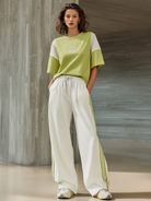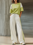 Women's Stylish Casual Green Color-block T-shirt And White Pants Set