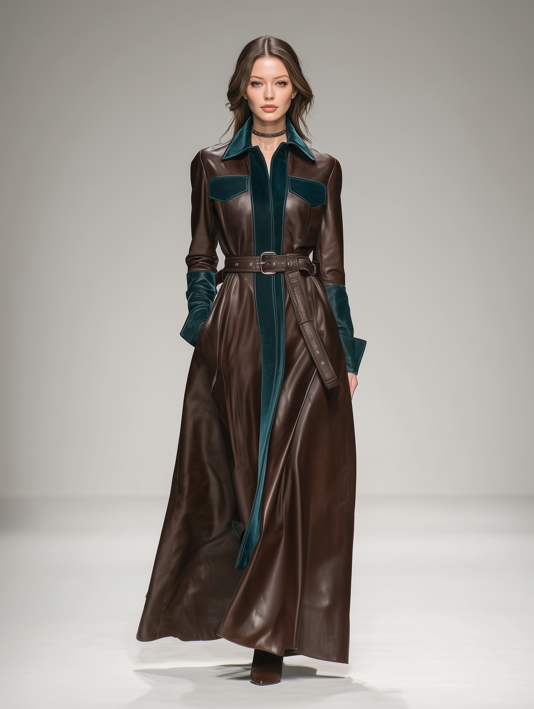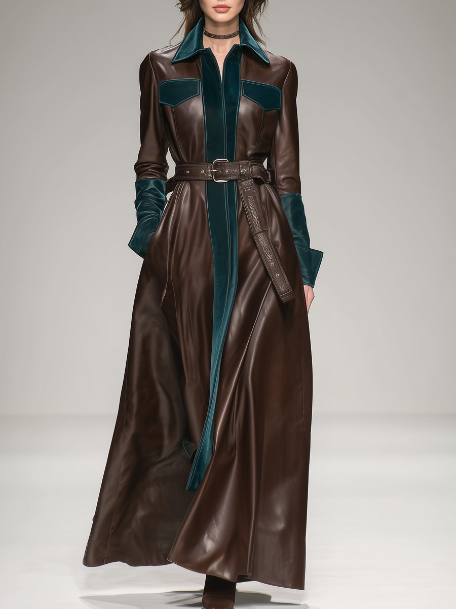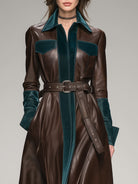 Introducing the Women's Belted Waist Leather Stitching Velvet Brown Leather Long Coat, a luxurious blend of comfort, elegance, and style. This exquisite outerwear piece features a sophisticated brown leather exterior with intricate stitching and elegant velvet accents. The coat's rich texture and tonal details make it a standout addition to any wardrobe. Its long, streamlined silhouette is paired with a belted waist to accentuate your shape, ensuring a flattering fit for all body types.