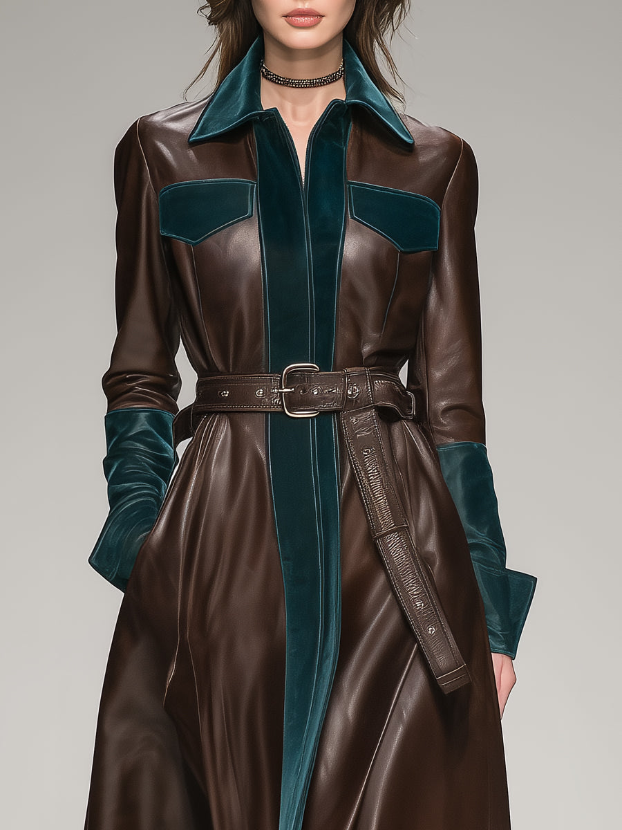 The Women's Belted Waist Leather Stitching Velvet Brown Leather Long Coat is a must-have for those seeking a blend of luxury and functionality. Its unique design and premium materials make it the perfect choice for autumn and winter, while its versatile style ensures you look effortlessly chic in any setting.