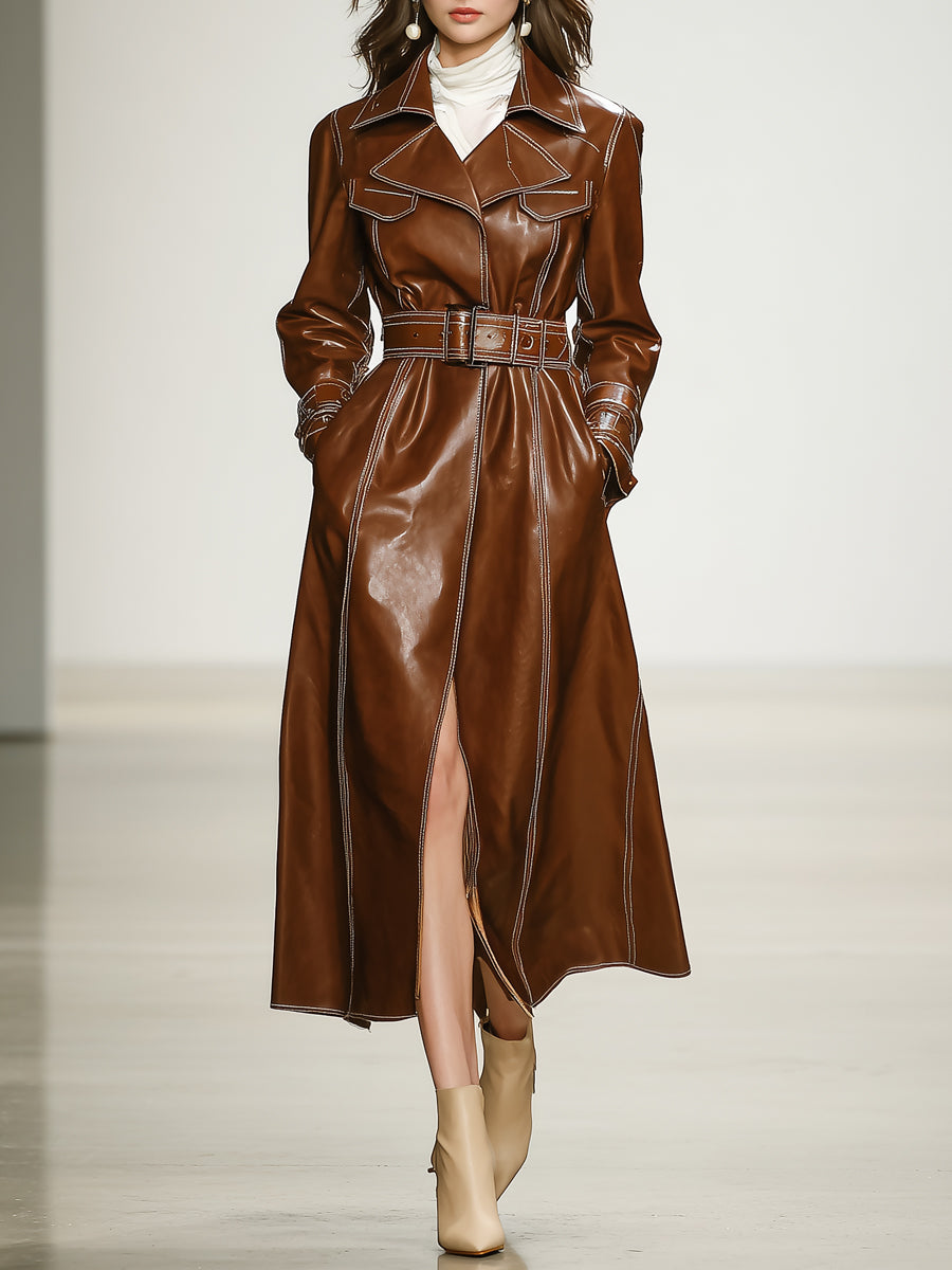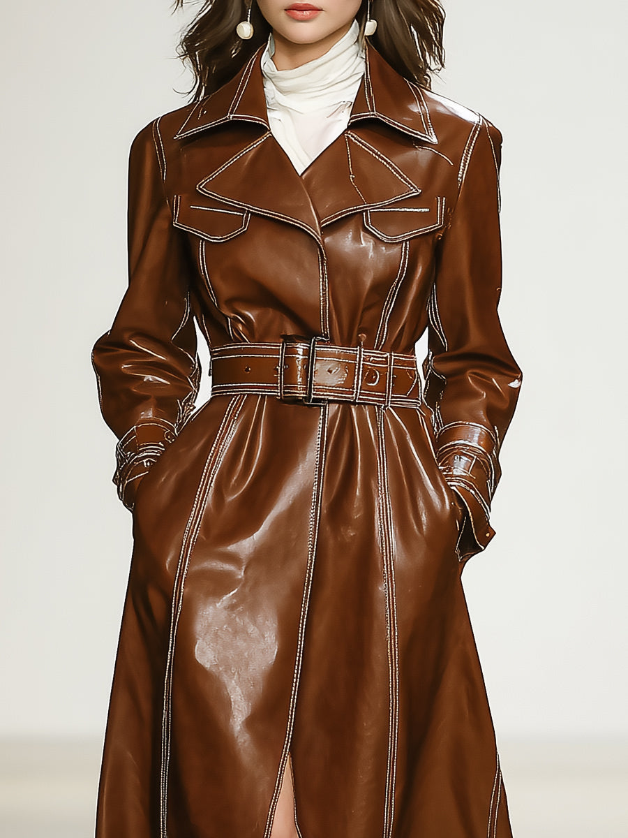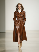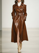 Women's Leather With Belt Waist Elegant Fashion Brown Coat Jacket